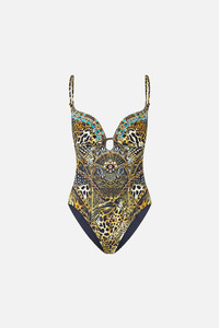 The Feline Folklore Continuous Underwire One Piece With Keyhole is a handcrafted silhouette designed by our in house artisans. Reimagined in an exclusive limited edition print, this one piece is made with D cups in mind with underwire support and adjustable straps for versatility. It features a keyhole at the centre of the bust and is finished with intricately placed crystal embellishments for luminous detail. - Fits D Cup - Soft Cups - Underwire Support - Adjustable Straps - Keyhole At Centre Front - Crystal Embellishment SKU 00039396-FELIFOLK-XS Size and Fit Our model is 5'10 (178cm) tall and wears a size S (AU 10). Bust: 40in (101.6cm) Waist: 26.5in (67cm) Hips: 38in (96.5cm) Fabric and Care MAIN: 80% REGENERATED POLYAMIDE, 20% ELASTANE
