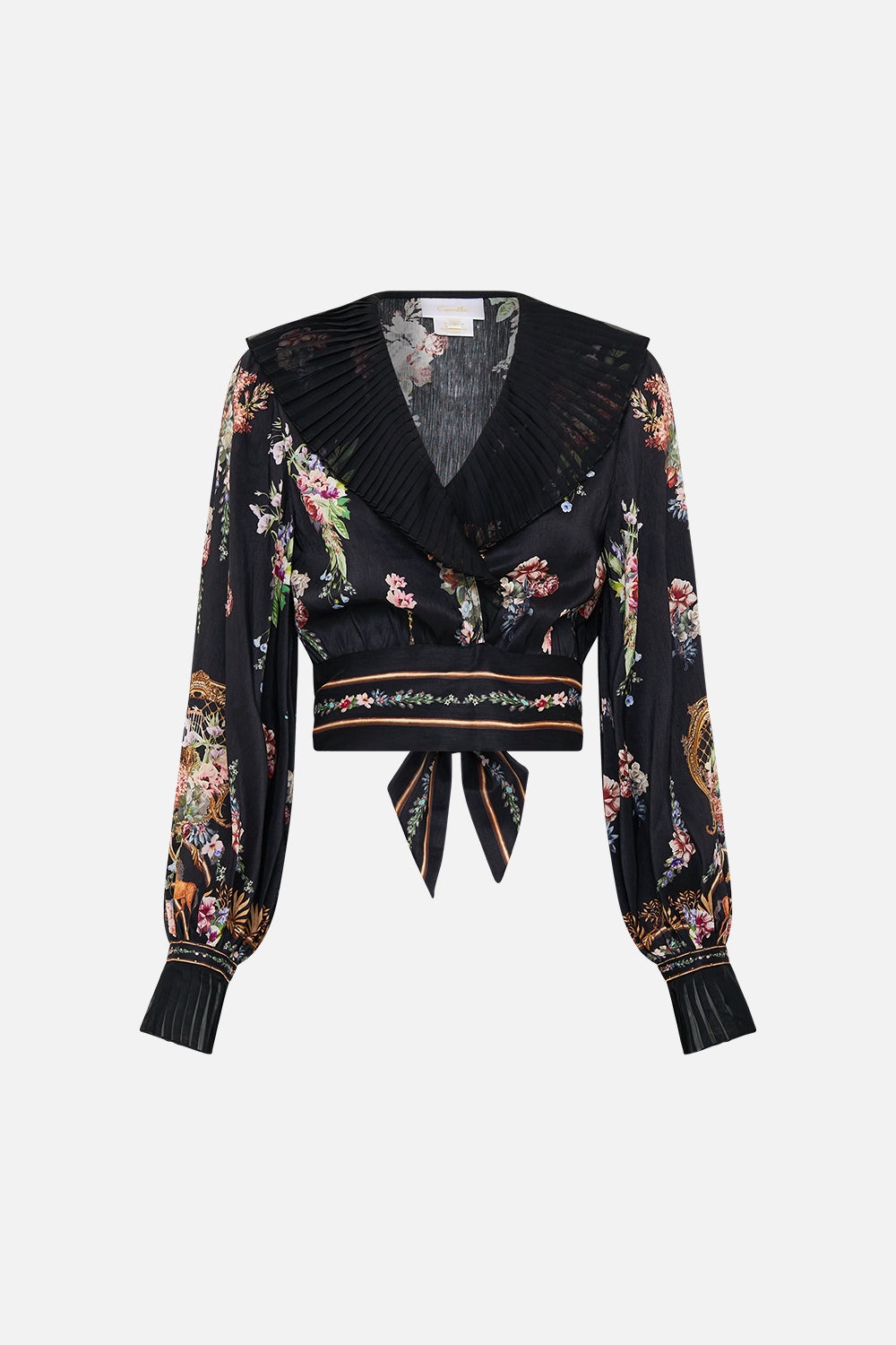 Designed in Australia, the Noble Endeavours Cropped Wrap Top With Pleated Detail embodies a white base fused with florals and golden arches, inspired by the arabesque opulence of the Palace of Queluz and its storied princess chambers. Lovingly handcrafted, this cropped wrap top features pleated collar and cuff details. A wrap tie closure and crystal embellishments bring a refined touch to its elevated, modern design. - Cropped Length - Pleated Collar And Cuff Detail - Wrap Tie Closure - Blouson Sleeve SKU 00034807-NOBLENDE-XS Size and Fit Our model wears a CAMILLA S and is 5'10 (178cm) tall. Her standard dress size is an AU 10. She has a 32in (83cm) bust, 35in (89.5cm) hips and a 25in (66cm) waist. Camilla S = AU10 / UK10 / US6 Fabric and Care 82% LINEN 18% SILK Grown organically, this lightweight natural fibre offers a timeless aesthetic that adds durability and longevity to any wardrobe. Its breathability keeps your skin cool, minimises moisture and ensures effortless comfort.