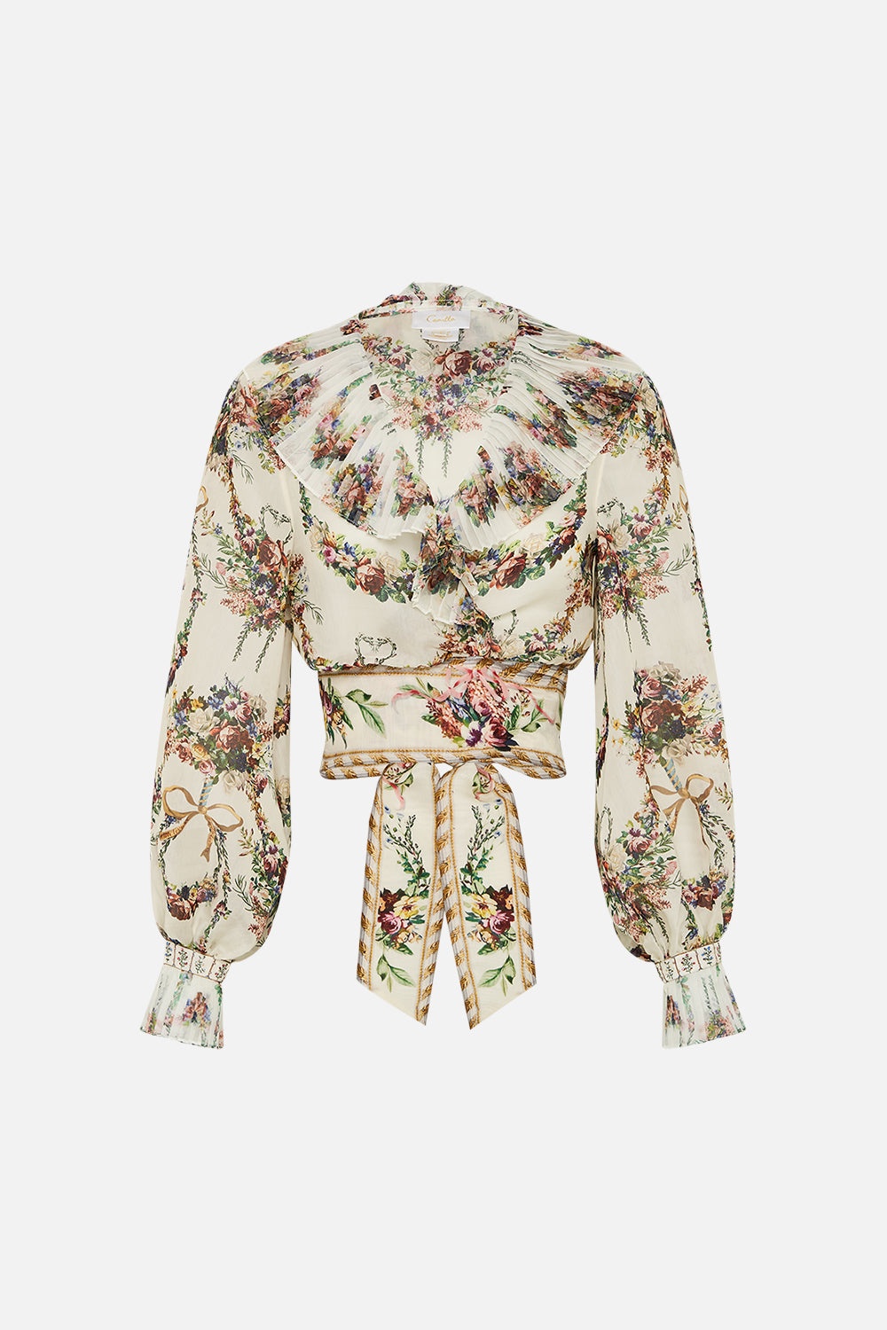 Designed in Australia, the Dressing Room Drama Cropped Wrap Top With Pleated Detail embodies a white base fused with florals and golden arches, inspired by the arabesque opulence of the Palace of Queluz and its storied princess chambers. Lovingly handcrafted, this cropped wrap top features pleated collar and cuff details. The wrap tie closure and crystal embellishments bring a refined touch to its playful, modern design. - Cropped Length - Pleated Collar And Cuff Detail - Wrap Tie Closure - Crystal Embellishment SKU 00034749-DRESDRAM-XS Fabric and Care 60% COTTON 40% SILK (ORGANZA)
