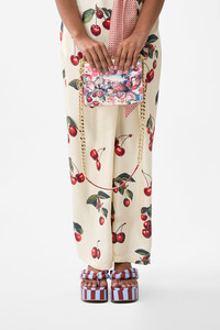 The Notes From The Road Crossbody Box Bag With Chain And Keyring is a handcrafted silhouette designed by our in house artisans. Reimagined in an exclusive limited edition print, our cross body bag is both playful and versatile as gold chain details shapeshift into adjustable lengths. Finished with a keyring and stud detailing, this bag reveals a generous interior with cardholders. - Crossbody Strap - Detachable Keyring - Internal Card Slots - Studded Details - 21cm X 17cm - Base Width 7cm SKU 00037584-NOTEROAD-O/S Fabric and Care MAIN: 100% POLYURETHANE