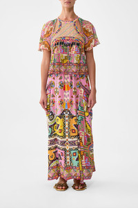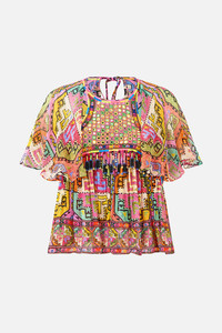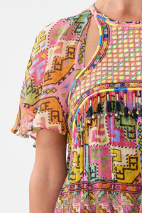The Patchwork Panorama Cut-Out Harness Top is a handcrafted cotton silhouette designed by our in house artisans. Reimagined in an exclusive limited edition print, this harness top is relaxed fitting and features heavy embroidery and beaded tassels at the front yoke. It's adorned with raglan sleeves with cut out details and is finished with generous neck ties and a keyhole feature at the back. - 100% Silk - Relaxed Fit - Raglan Sleeves With Cut Outs - Heavy Embroidery And Beaded Tassels At Front Yoke - Neck Tie At Back With Key Hole SKU 00036937-PATCPANO-XS Size and Fit Our model is 5'10 (178cm) tall and wears a size S (AU 10). Bust: 40in (101.6cm) Waist: 26.5in (67cm) Hips: 38in (96.5cm) Designed and fitted true to size, take your normal size. Fabric and Care 100% SILK Silk crinkle chiffon is a sheer, lightweight fabric with a textured surface, crafted for a fluid drape with delicate stretch and a soft bounce.