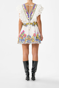 The Milla In Sevilla Double Frill Sleeve Mini Dress is a handcrafted silhouette designed by our in-house artisans. Brought to life in an exclusive limited edition print, our cotton mini sundress is thoughtfully cut to cinch at the waist before flaring into a cropped hemline. It features a deep v-neckline that meets layered frill sleeves, before intricately applied crystal embellishment offers the finishing touch. - 100% Organic Cotton - Fitted Waistband - Double Frill Sleeves - Shirred Back Waist - Mini Length - Crystal Embellishment SKU 00041983-MILLSEVI-XXS Size and Fit Our model is 5'10 (178cm) tall and wears a size S (AU 10). Bust: 40in (101.6cm) Waist: 26.5in (67cm) Hips: 38in (96.5cm) Fabric and Care 100% COTTON Organic cotton poplin is sumptuously smooth with a crisp, refined weave. This lightweight silken fabric drapes beautifully and is ideal for sleek contours and tailored, defined styles.