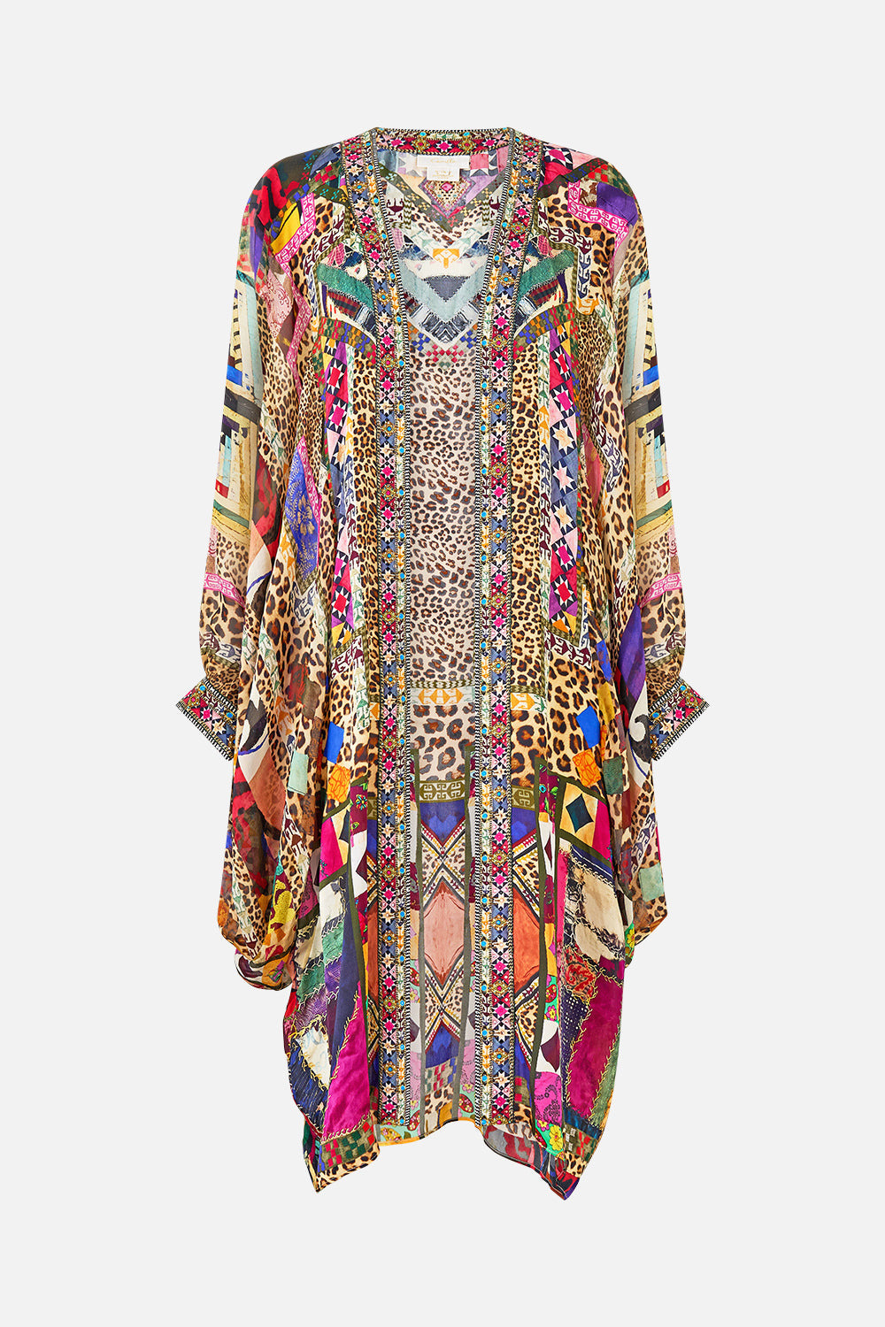 The Embroidered Ever After Dramatic Sleeve Cocoon Layer is a handcrafted silk silhouette designed by our in house artisans. Reimagined in an exclusive limited edition print, our cocoon shaped layer features voluminous blouson sleeves with buttoned cuffs for a tailored finish. Adorned with intricately applied crystal embellishment, draped in dimension and flowing detail. - 100% Silk - Crystal Embellishment - Blouson Sleeve - Buttons On Cuff - Cocoon Shape SKU 00037164-EMBREVER-O/S Size and Fit Our model wears a CAMILLA O/S and is 5'10 (178cm) tall. Her standard dress size is an AU 10. She has a 32in (83cm) bust, 35in (89.5cm) hips and a 25in (66cm) waist. Designed as a relaxed fit. Take your normal size, or select one size smaller for a neater fit. Fabric and Care 100% SILK Silk satin embodies a sumptuously smooth finish that offers a rich buttery touch to the skin. As a result of the satin weaving technique, it masterfully creates a fuller bounce to the body and drape details.