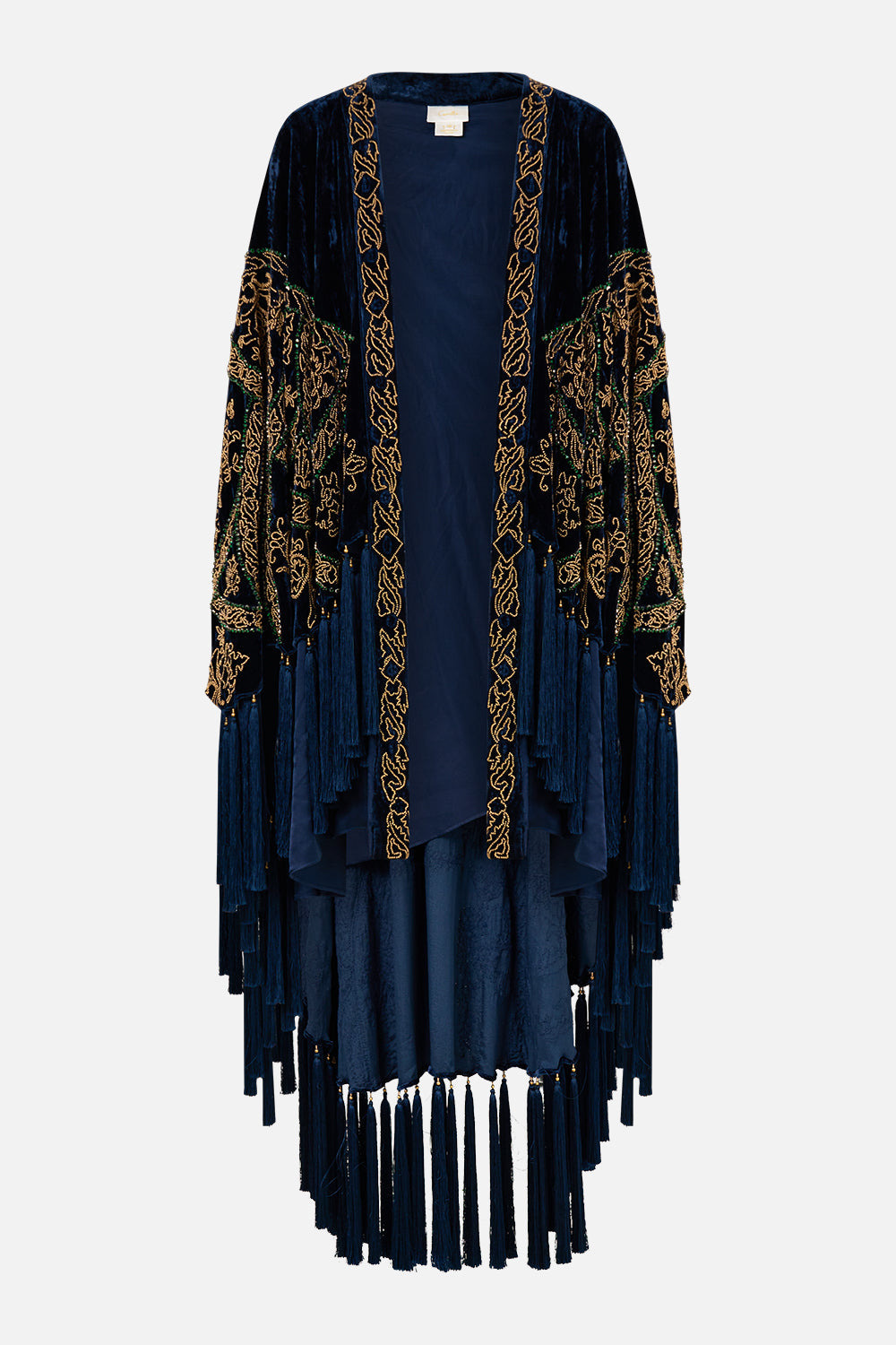 Taking 230 hours to craft, this exquisite draped layer is a true celebration of craftsmanship and creativity, featuring a rich mix of textures and artistry. The silhouette is meticulously hand-embroidered and adorned with intricate seed beadwork in varying sizes, shimmering rhinestone embellishments and delicate silk tassels— each element thoughtfully placed across the garment. A radiant expression of time, technique and imagination, this statement piece is a wearable work of art. The The Imperial Gate Draped High-Low Layer is a handcrafted velvet silhouette designed by our in house artisans. Reimagined in an exclusive limited edition print, this draped layer is crafted from plush velvet and cut in a soft, loose fit. A dramatic high-low hemline creates fluid movement, while hand-beaded embellishments add detail and texture. Designed as a statement layering piece to elevate both day and evening styling. - Hand Beaded Embellishment - Loose Fit - High Low Hem - Velvet Fabrication SKU 00037871-IMPEGATE-O/S Size and Fit Our model wears a CAMILLA O/S and is 5'10 (178cm) tall. Her standard dress size is an AU 10. She has a 32in (83cm) bust, 35in (89.5cm) hips and a 25in (66cm) waist. Designed as a regular fit. Take your normal size, or select one size smaller for a neater fit. Fabric and Care 82% VISCOSE, 18% SILK Silk velvet is an opulent fabric that reflects light, creating a magical interplay of luminance and shadow. Worn by royalty, its soft, iridescent surface compliments its dense body, creating decadent depth and dimension.