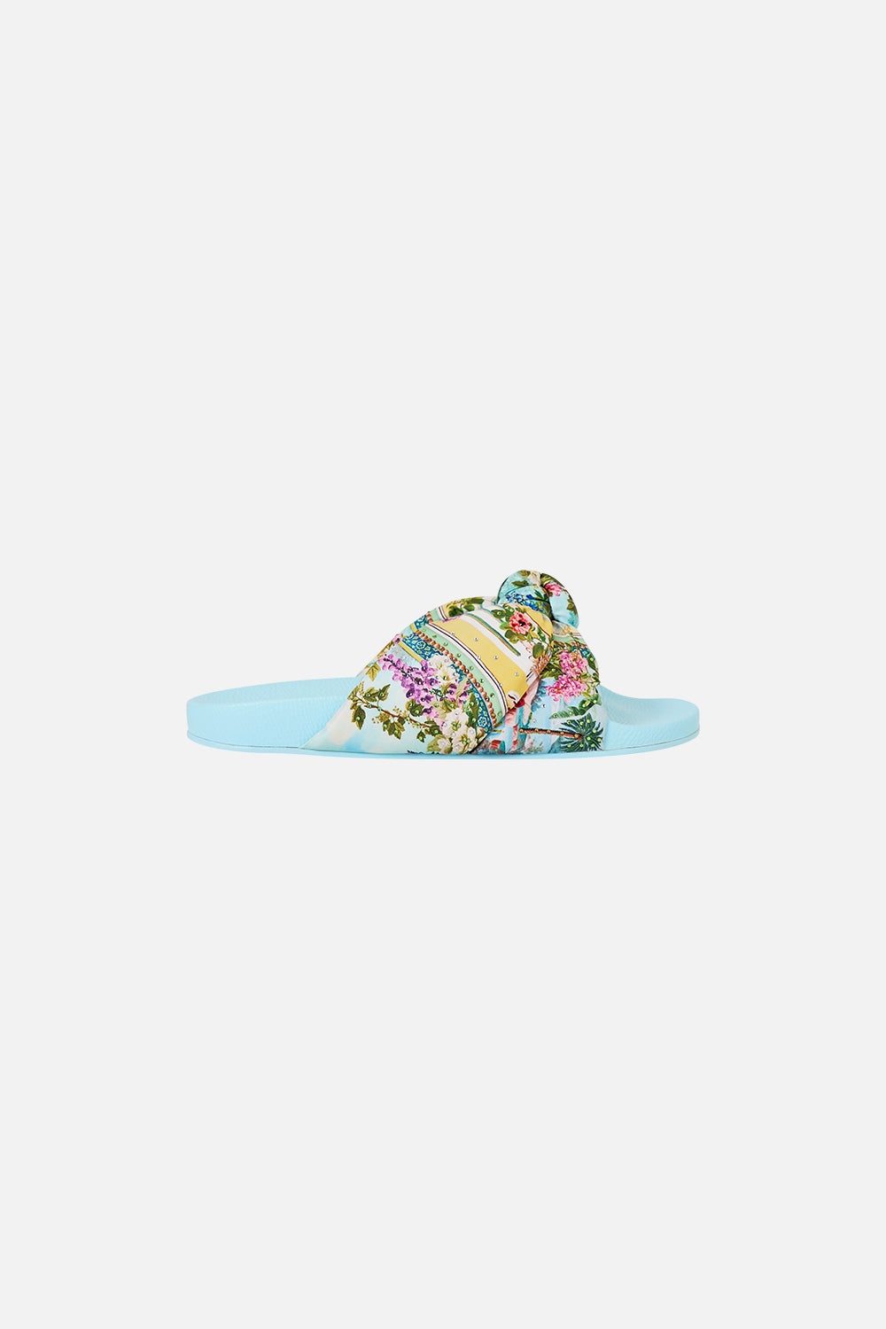 The Tales Of Topkapi Palace Ebony Knotted Slide is a handcrafted accessory designed by our in house artisans. Reimagined in an exclusive limited edition print, our knotted slide features a padded CAMILLA branded sole, adorned with crystal embellishment. Made for sun-filled days and effortless wanderings. - Flat Slide Style - Knotted Padded Upper - Camilla Printed - Camilla Branded Sole - Crystals - Height 2cm SKU 00037726-TALETOPI-36 Fabric and Care UPPER: POLYESTER, SOLE: RUBBER