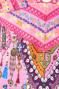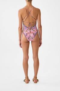 The Patchwork Panorama Embroidered Tri One Piece W Tie Back is a handcrafted silhouette designed by our in house artisans. Reimagined in an exclusive limited edition print, this one piece is made with C to D cups in mind with removable soft cups and cross over straps that tie at the back. Crochet embroidered cups offer artisanal texture, while it's ties are adorned with bespoke charm trims. It's finished with a regular leg line and moderate bottom coverage. - To Fit C to D Cup - Removable Soft Cups, Crochet And Embroidery Detail On Cups - Regular Leg Line, Moderate Bottom Coverage - Ties With Charm Trim Detail, Embroidery Detail - Cross Strap Tie Back With Charms On Ties SKU 00037488-PATCPANO-XS Size and Fit Our model is 5'10 (178cm) tall and wears a size S (AU 10). Bust: 40in (101.6cm) Waist: 26.5in (67cm) Hips: 38in (96.5cm) Fabric and Care MAIN: 82% REGENERATED POLYAMIDE, 18% ELASTANE ECONYL is regenerated nylon, crafted from waste materials that would otherwise end up polluting our Mother Earth. Its beauty lies in its ability to be recycled, remoulded and ultimately reused time and time again. An infinitely recyclable product that keeps our planet looking beautiful, it opens the door to a circular fashion sphere.