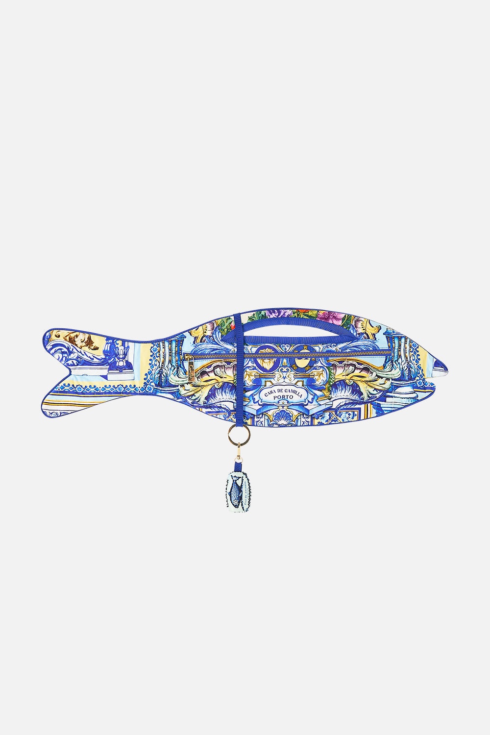 Designed in Australia, The Wall To Wall Wonders Fish Clutch captures the grandeur of Queluz Palace, with soft blues and golden yellows of Azulejo tiles, blending history and artistry in a panoramic view of Portugal’s timeless beauty. Lovingly handcrafted, this fish clutch is a sublime fusion of art and allure. Draped in signature CAMILLA print, it glimmers with crystal embellishments, echoing the fluidity of the sea. A zipper pocket opening and keyring embellishment offer subtle utility, while the wide handle completes the design—an elegant nod to Portugals seaside charm.. - CAMILLA Printed - Crystal Embellishment - Zipper Pocket Opening - Keyring Embellishment - Wide Handle SKU 00034256-WALLWOND-O/S Fabric and Care MAIN: 100% SILK Silk satin embodies a sumptuously smooth finish that offers a rich buttery touch to the skin. As a result of the satin weaving technique, it masterfully creates a fuller bounce to the body and drape details.