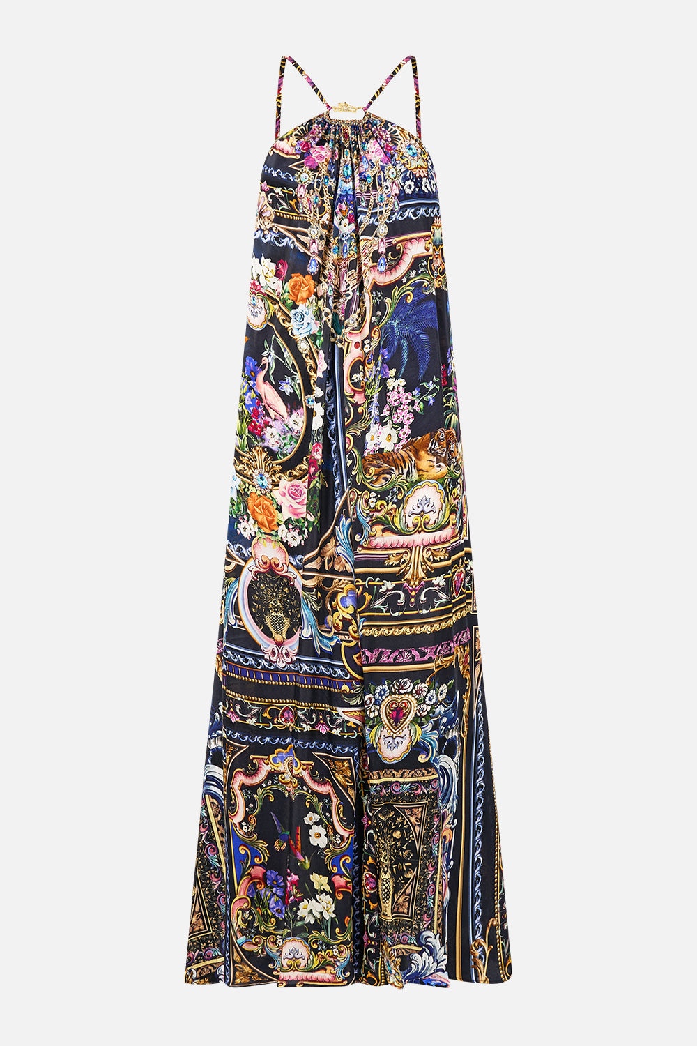Designed in Australia, the Basked In Baroque Gather Neck Hardware Maxi Dress celebrates the vivid contrasts of Igreja Matriz De Santa Maria. Painterly prints reflect its dynamic artistry, steeped in timeless energy and colour. Lovingly handcrafted, this luxury CAMILLA silk maxi dress features a bespoke hardware ring detail that creates a gathered neckline that falls into a relaxed A-line maxi silhouette. Adjustable straps and a back neckline allow for an opulently personalized fit. - Relaxed Fit - Full Length With Hi-Lo Hem - Gathered Neckline - Bespoke CAMILLA Hardware Ring Designed In-House SKU 00035445-BASKBARO-XS Size and Fit Designed as a relaxed fit—take your normal size, or select one size smaller for a neater fit. Fabric and Care 100% SILK Silk satin embodies a sumptuously smooth finish that offers a rich buttery touch to the skin. As a result of the satin weaving technique, it masterfully creates a fuller bounce to the body and drape details.