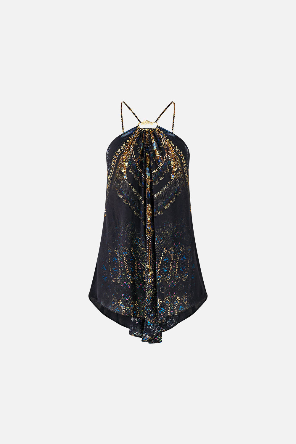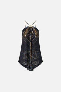 The Song Of The Solstice Gather Neck Hardware Top is a handcrafted silk silhouette designed by our in house artisans. Reimagined in an exclusive limited edition print, our gather neck top features a softly gathered neckline and bespoke CAMILLA hardware that anchors the design. Adjustable straps add versatility and comfort. - 100% Silk - Relaxed Fit - Gathered Neckline - Bespoke Camilla Neck Hardware - Adjustable Straps SKU 00037267-SONGSOLS-XXS Size and Fit Our model is 5'10 (178cm) tall and wears a size S (AU 10). Bust: 40in (101.6cm) Waist: 26.5in (67cm) Hips: 38in (96.5cm) Fabric and Care 100% SILK Silk satin embodies a sumptuously smooth finish that offers a rich buttery touch to the skin. As a result of the satin weaving technique, it masterfully creates a fuller bounce to the body and drape details.