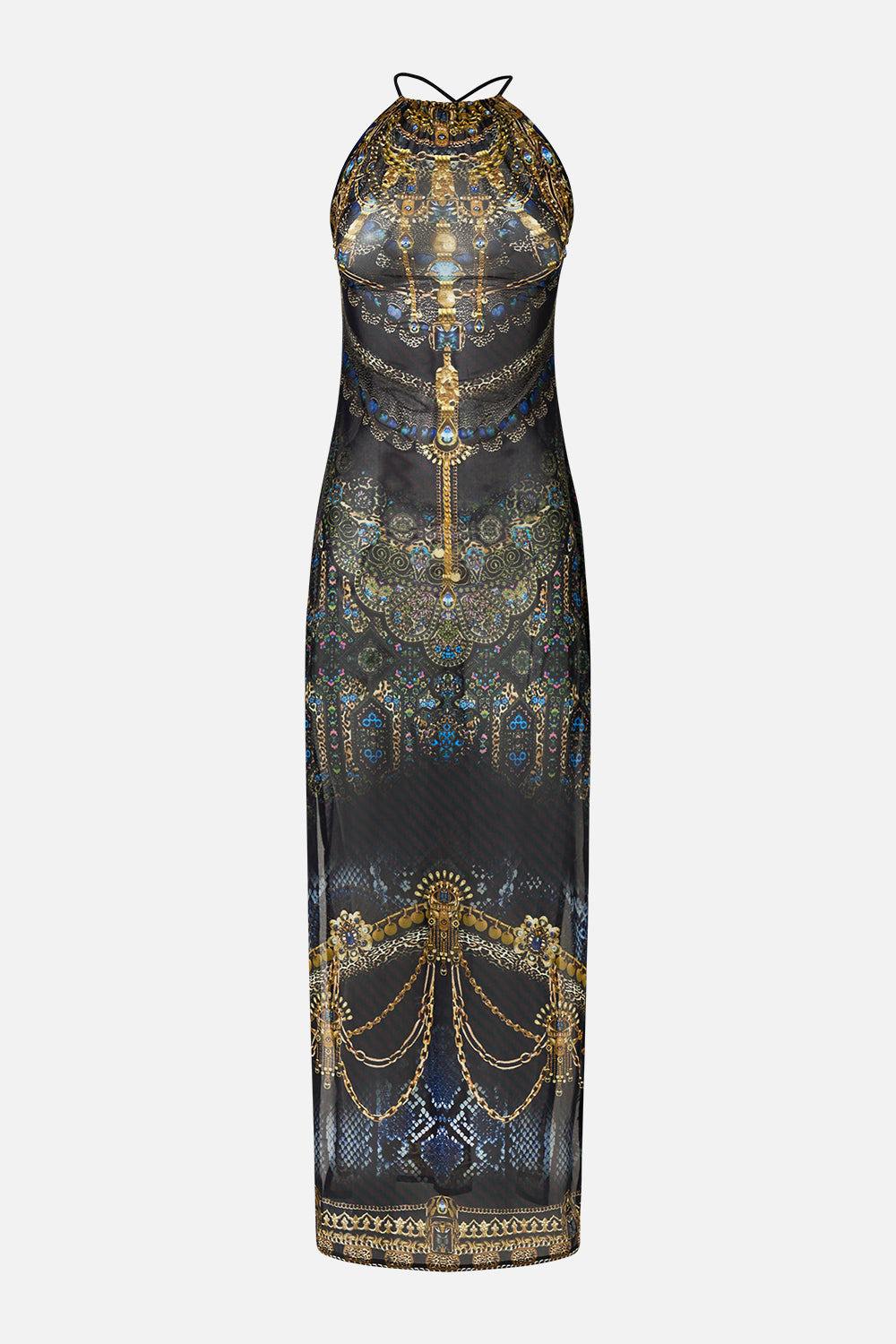 The Song Of The Solstice High Neck Beach Maxi Dress With Tie Back is a handcrafted silhouette designed by our in house artisans. Reimagined in an exclusive limited edition print, our beach maxi dress features a gathered high neckline and a scoop cross back with ties. Decorated with charms, a full length skirt is elevated with side splits, as intricately applied crystal embellishments offer the finish touch. - Gathered High Neck - Scoop Cross Back With Tie (Tie Has Charms On Ends) - Side Splits - Long (Maxi) Length - Crystal Embellishment - Mesh Swim Cover Up SKU 00037550-SONGSOLS-XS Size and Fit Our model is 5'10 (178cm) tall and wears a size S (AU 10). Bust: 40in (101.6cm) Waist: 26.5in (67cm) Hips: 38in (96.5cm) Fabric and Care MAIN: 94% NYLON, 6% ELASTANE