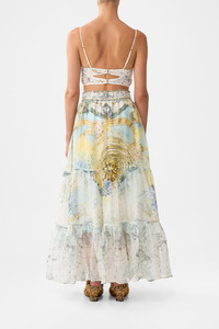 The My Lucky Stars High Waisted Tiered Skirt is a handcrafted silk silhouette designed by our in house artisans. Reimagined in an exclusive limited edition print, this skirt is cut in a high waisted fit and features sumptuous tiered panels that cascade into a full length hemline. The decadent design is crafted for romantic movement with every step. - 100% Silk - High Waisted - Tiered Skirt - Maxi Length - Silk Organza SKU 00036678-LUCKSTAR-XS Size and Fit Our model is 5'10 (178cm) tall and wears a size S (AU 10). Bust: 40in (101.6cm) Waist: 26.5in (67cm) Hips: 38in (96.5cm) Designed and fitted true to size, take your normal size. Fabric and Care 100% SILK L-80% COTTON, 20% SILK
