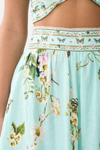 Designed in Australia, the Floral Freefall High Waisted Tiered Skirt floats on a dreamscape of baby blue and purple. Botanical motifs cascade across embroidered textiles, capturing the poetry of wildflower fields. Lovingly handcrafted, this luxury maxi skirt features a high-waisted silhouette with tiered panels and delicate lace inserts. Adorned with lavish embroidery details, this maxi skirt exudes signature CAMILLA opulence. - High Waisted - Tiered Skirt - Maxi Length - Back Zip Closure SKU 00035367-FLORFREE-XXS Size and Fit Our model wears a CAMILLA S and is 5'10 (178cm) tall. Her standard dress size is an AU 10. She has a 32in (83cm) bust, 35in (89.5cm) hips and a 25in (66cm) waist. Camilla S = AU10 / UK10 / US6 Fabric and Care 100% LINEN Made from flax fibres, this lightweight natural fibre offers a timeless aesthetic that adds durability and longevity to any wardrobe. Its breathability keeps your skin cool, minimises moisture and ensures effortless comfort.
