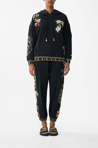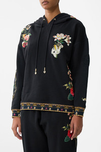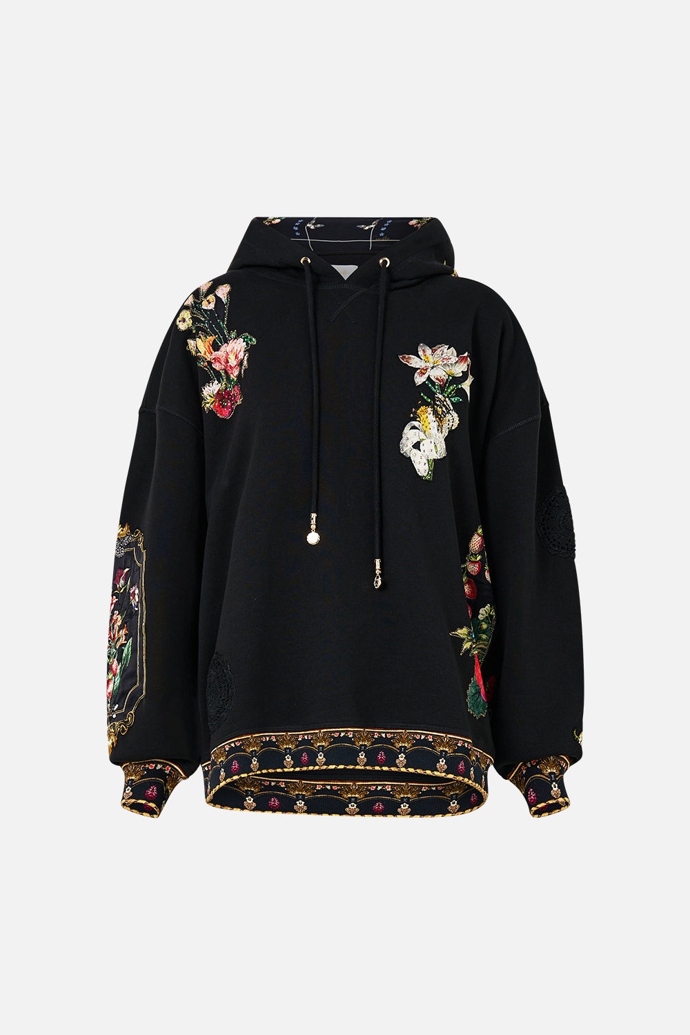 Designed in Australia, the Noble Endeavours Hoodie With Pockets unveils a black base fused with florals and gilded arches, echoing the regal opulence of the Palace of Queluz—a poetic nod to throne rooms and the queen's dressing sanctuary. This luxury CAMILLA hoodie sweater features an oversized fit throughout the body with generous length upon the hemline and sleeves finished with sumptuous ribbed details. With pocket details a lavish silk lined hood and custom tassels this oversized hoodie exudes designer loungewear. - Oversized Hoodie Sweater - Printed Silk Lining In Hood And Pocket Bags - Applique Printed Patches - Crystal Embellishment - Pockets SKU 00035827-NOBLENDE-XS Size and Fit Our model wears a CAMILLA S and is 5'10 (178cm) tall. Her standard dress size is an AU 10. She has a 32in (83cm) bust, 35in (89.5cm) hips and a 25in (66cm) waist. Camilla S = AU10 / UK10 / US6 Designed as an oversized silhouette—take your normal size, or select one size smaller for a neater fit. Fabric and Care SHELL-'100% COTTON , CONST- 100% SILK, LINNING- 100% SILK Organic cotton is breathable, lightweight fabric. With a natural texture, it holds its shape gracefully and is perfect for soft, everyday silhouettes.