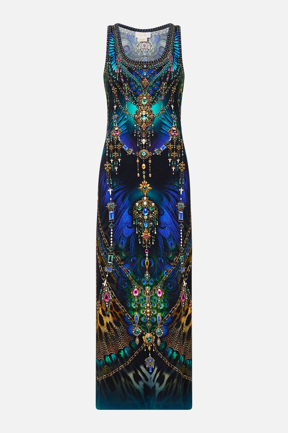 Designed in Australia, the Dominican Decadence Jersey Scoop Neck Tank Dress unfolds in decadent plumes and iridescent blues, teal waves shimmer like glass, capturing the sparkle of forgotten monuments. Lovingly handcrafted with meticulous attention to detail, this stunning dress features a scooped neckline that exudes grace, a figure-hugging midi length silhouette that caresses your curves and cinches your waistline for truly captivating allure - Sleeveless - Fitted Style - Scoop Front Neckline - Midi Length - Crystal Embellishment SKU 00035102-DOMIDECA-XXS Fabric and Care 92% VISCOSE 8% ELASTANE Viscose is a fibre crafted from the natural substance, cellulose, known for its softness, breathability and drape. It possesses a subtle sheen and is perfect for lightweight soft tailored silhouettes or more structured styles in heavier weights.