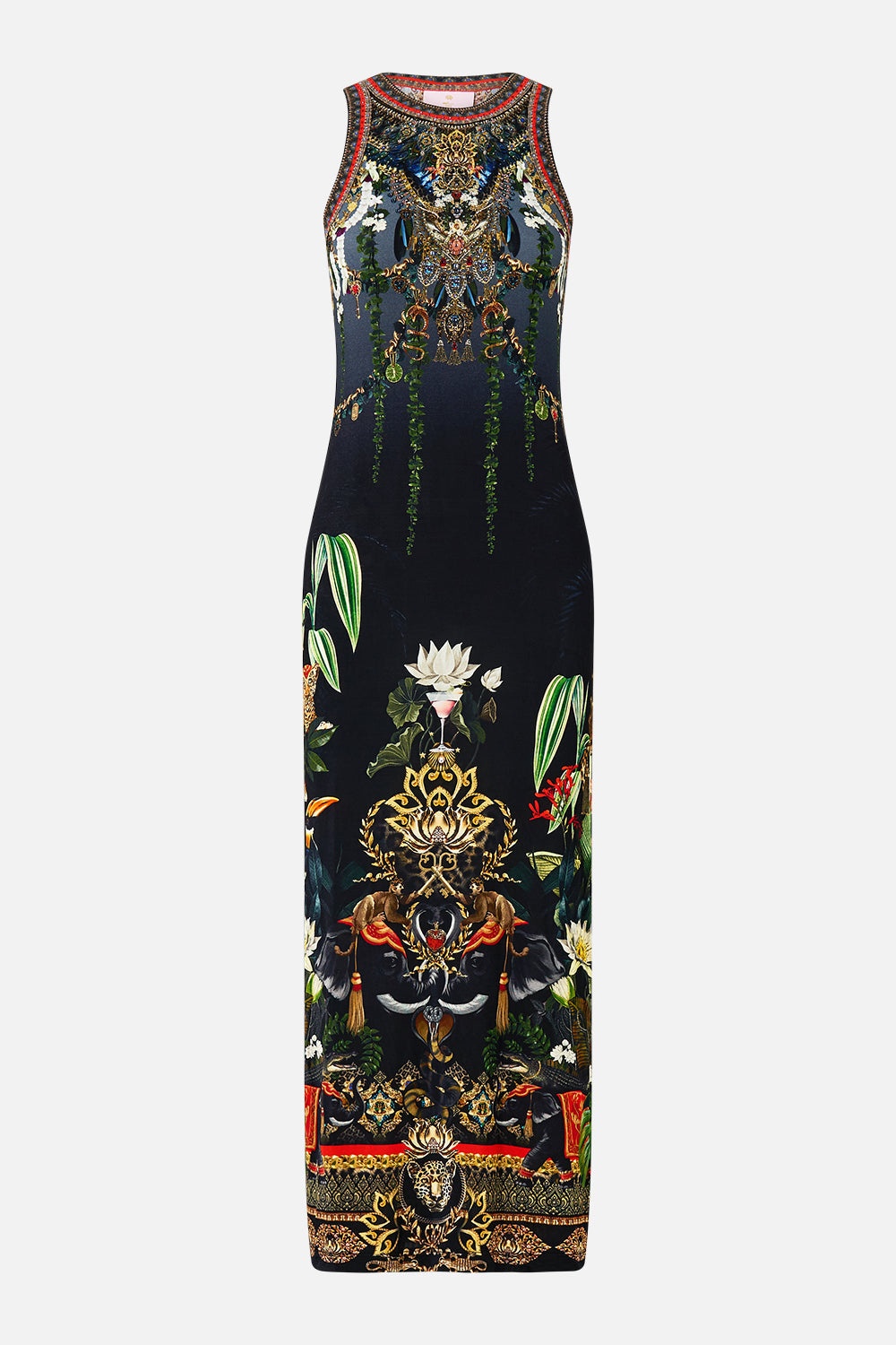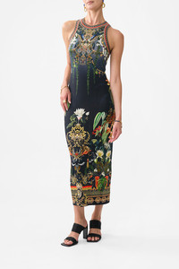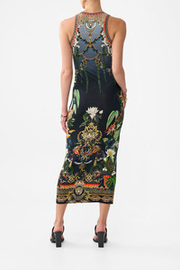 Designed in Australia, The Ready For My Welcome Drink Jersey Tank Dress checks you into The White Lotus where exotic blooms and untamed wildlife intertwine, weaving an enigmatic tapestry that evokes the mystique of global explorations. Lovingly handcrafted, this luxury jersey midi dress showcases a fitted silhouette that caresses your curves and falls to mid calf length. A chic sleeveless style with slightly lowered armholes, a scooped neckline and slight racer back create an elegant line. - Sleeveless - Scoop Neck - Fitted Style - Crystal Embellishment - Non-Sheer - Midi Length SKU 00037960-THAILAND-XXS Size and Fit Designed and fitted true to size, take your normal size Fabric and Care SHELL- 92% VISCOSE 8% ELASTANE, CONST- 96% COTTON 4% ELASTANE Viscose is a fibre crafted from the natural substance, cellulose, known for its softness, breathability and drape. It possesses a subtle sheen and is perfect for lightweight soft tailored silhouettes or more structured styles in heavier weights.