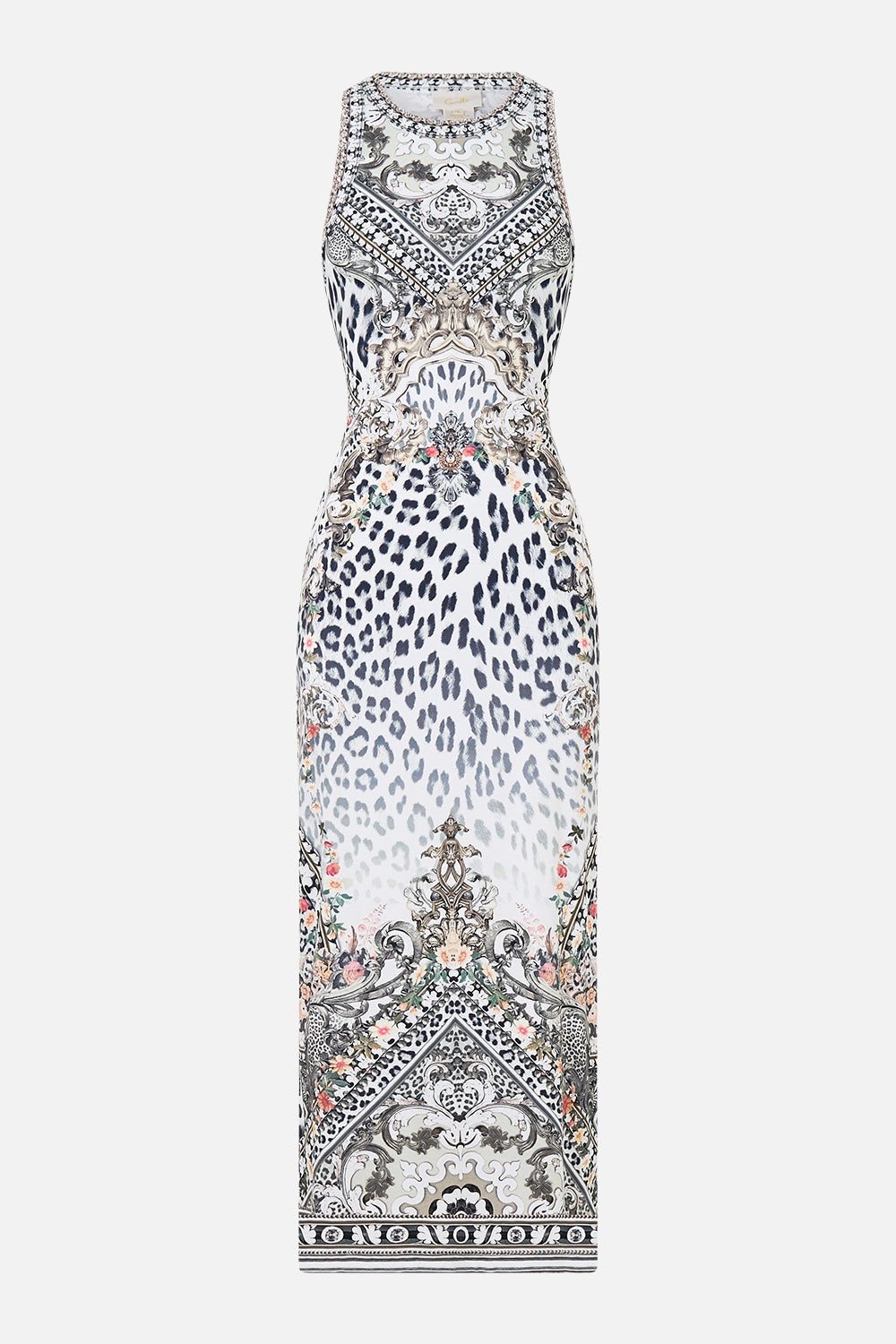 Designed in Australia, the Marble Heaven Jersey Tank Dress dances between leopard prints and marble textures, patterns that glint with opulence, evoking whispers of lost artisans and their inspired creations. Lovingly handcrafted, this luxury jersey midi dress showcases a fitted silhouette that caresses your curves and falls to mid-calf length. A bodycon sleeveless style with slightly lowered armholes, a scooped neckline and slight racer back create an visually elongarted line. - Sleeveless - Scoop Neck - Fitted Style - Crystal Embellishment - Midi Length SKU 00039653-MARBHEAV-XXS Size and Fit Our model wears a CAMILLA S and is 5'10 (178cm) tall. Her standard dress size is an AU 10. She has a 32in (83cm) bust, 35in (89.5cm) hips and a 25in (66cm) waist. CAMILLA Size S = AU10 / UK10 / US6 Our More to Love Model wears a CAMILLA Size 3XL and is 5'9 (182cm) tall. Her standard dress size is a AU 20. She has a 42in (107cm) bust, 35.8in (91cm) waist and 46in (118cm) hips. CAMILLA Size 3XL = AU20 / UK20 / US16 Designed and fitted true to size, take your normal size. Fabric and Care SHELL- '95% COTTON 5% SPANDEX , CONST- 96% COTTON 4% SPANDEX