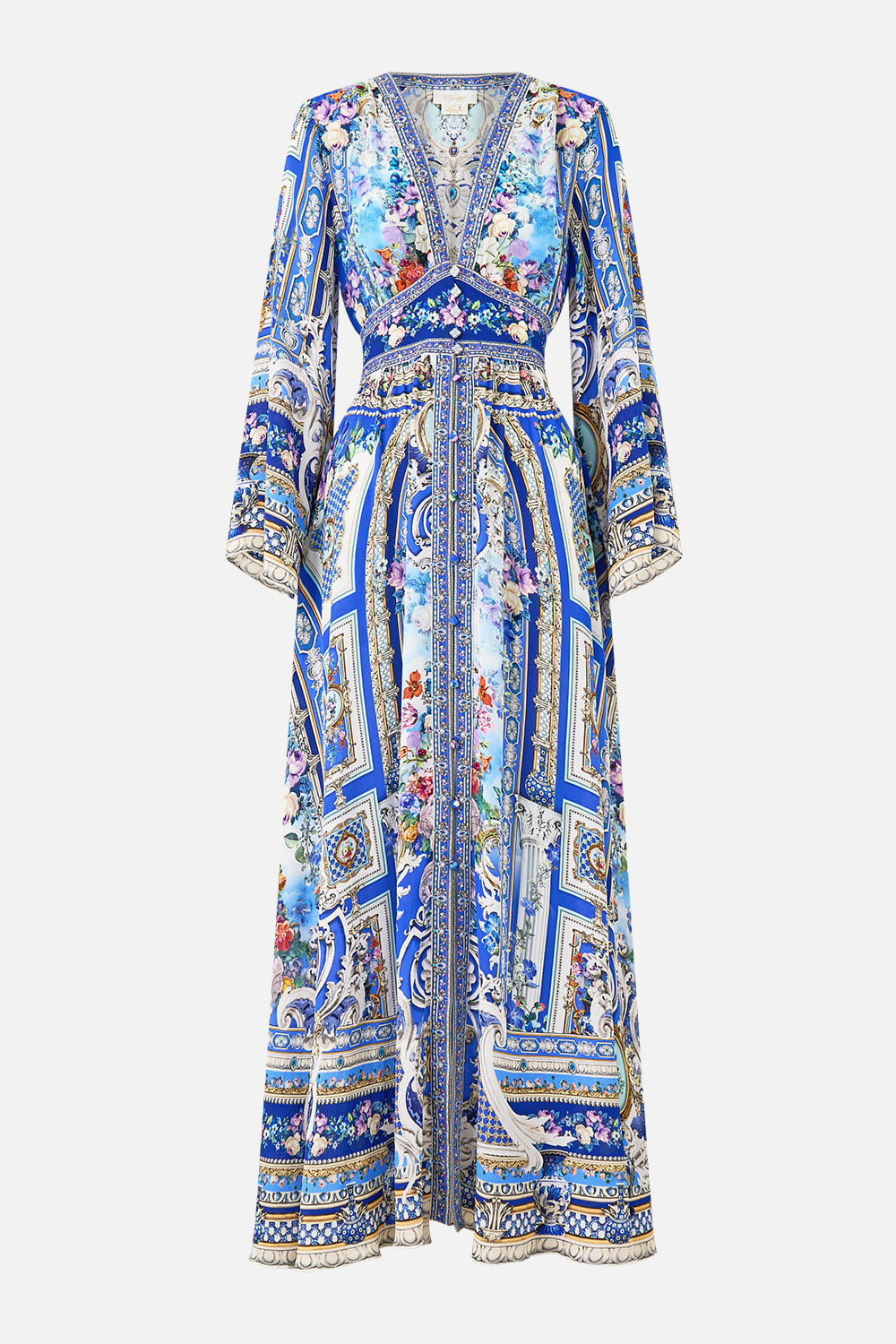 The Ottoman Opulence Kimono Sleeve Dress With Shirring Detail is a handcrafted silhouette designed by our in house artisans. Reimagined in an exclusive limited edition print, our kimono sleeve maxi dress is an ode to feminine form and refined drama. A softly bloused bodice tapers into a defined waistband with a delicate button-front closure, creating shape and balance. Its full-length skirt falls in gentle gathers and sweeping kimono sleeves flare at the wrists. Its finished with intricately placed crystal embellishments for luminous detail. - 100% Silk - Fitted Waistband - Full Length - Kimono Sleeve - Button Front Closure - Crystal Embellishment - Silk Crepe Fabric SKU 00038885-OTTOOPPU-XXS Size and Fit Our model wears a CAMILLA S and is 5'10 (178cm) tall. Her standard dress size is an AU 10. She has a 32in (83cm) bust, 35in (89.5cm) hips and a 25in (66cm) waist. CAMILLA Size S = AU10 / UK10 / US6 Our More to Love Model wears a CAMILLA Size 3XL and is 5'9 (182cm) tall. Her standard dress size is a AU 20. She has a 42in (107cm) bust, 35.8in (91cm) waist and 46in (118cm) hips. CAMILLA Size 3XL = AU20 / UK20 / US16 Designed as a relaxed fit. Take your normal size, or select one size smaller for a neater fit. Fabric and Care SELF-100% SILK, CONTRAST-100% SILK Designed as a relaxed fit. Take your normal size, or select one size smaller for a neater fit.