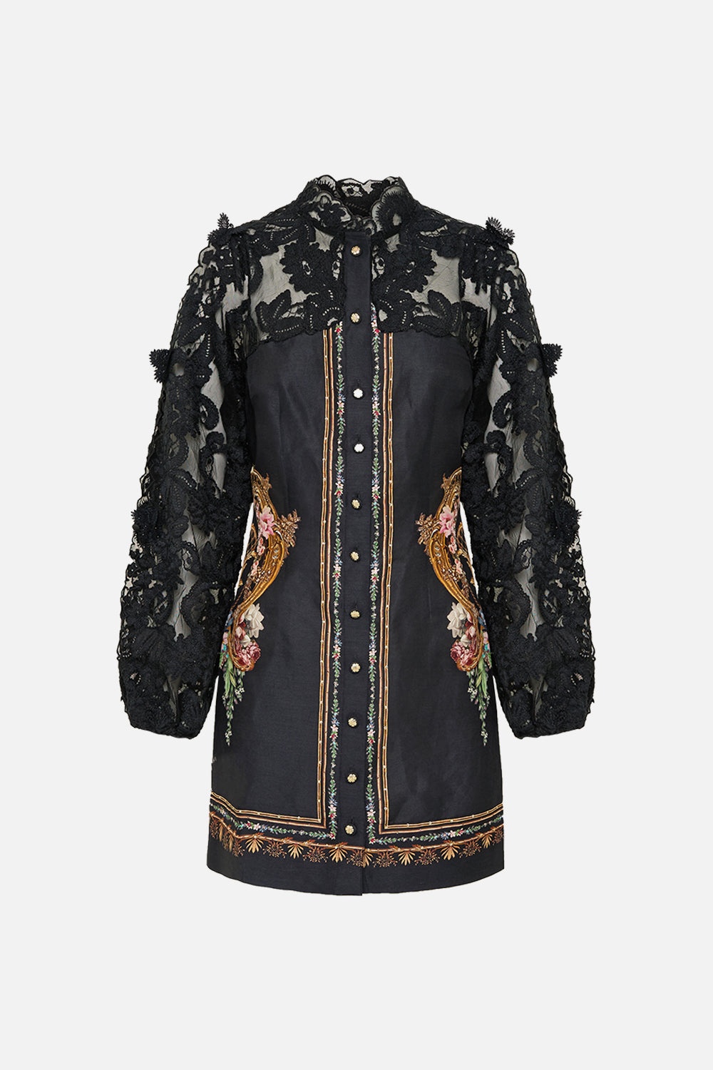 Designed in Australia, the Noble Endeavours Lace Sleeve Mini Dress embodies a white base fused with florals and golden arches, inspired by the arabesque opulence of the Palace of Queluz and its storied princess chambers. Lovingly handcrafted, this lace sleeve mini dress features front button detailing and a stand collar. Crystal embellishments add a luxurious touch to its refined design. - Lace Sleeve Mini Dress - Front Button Detail - Stand Collar - Crystal Embellishment SKU 00034816-NOBLENDE-XXS Size and Fit Our model wears a CAMILLA S and is 5'10 (178cm) tall. Her standard dress size is an AU 10. She has a 32in (83cm) bust, 35in (89.5cm) hips and a 25in (66cm) waist. Camilla S = AU10 / UK10 / US6 Fabric and Care 82% LINEN 18% SILK Silk Linen is a beautiful combination of natural fabrics which blend into a luxurious, soft and smooth texture. Cool to touch with a subtle sheen and luster from silk components, its breathable, durable and has a crisp, textured hand feel.