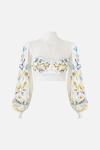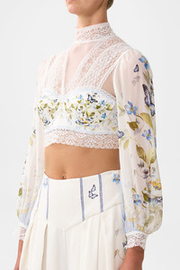The Botanical Ballads Lace Splice Top With Long Sleeve is a handcrafted silk silhouette designed by our in house artisans. Reimagined in an exclusive limited edition print, our fitted cropped top features beautiful lace splice panels and voluminous long blouson sleeves. Finished with a centre back zip for a structured, form enhancing fit. - 100% Silk - Fitted Cropped Style - Lace Splice Panels - Long Blouson Sleeves - Centre Back Zipper SKU 00036499-BOTABALL-XXS Size and Fit Our model is 5'10 (178cm) tall and wears a size S (AU 10). Bust: 40in (101.6cm) Waist: 26.5in (67cm) Hips: 38in (96.5cm) Fabric and Care 100% SILK Silk satin embodies a sumptuously smooth finish that offers a rich buttery touch to the skin. As a result of the satin weaving technique, it masterfully creates a fuller bounce to the body and drape details.
