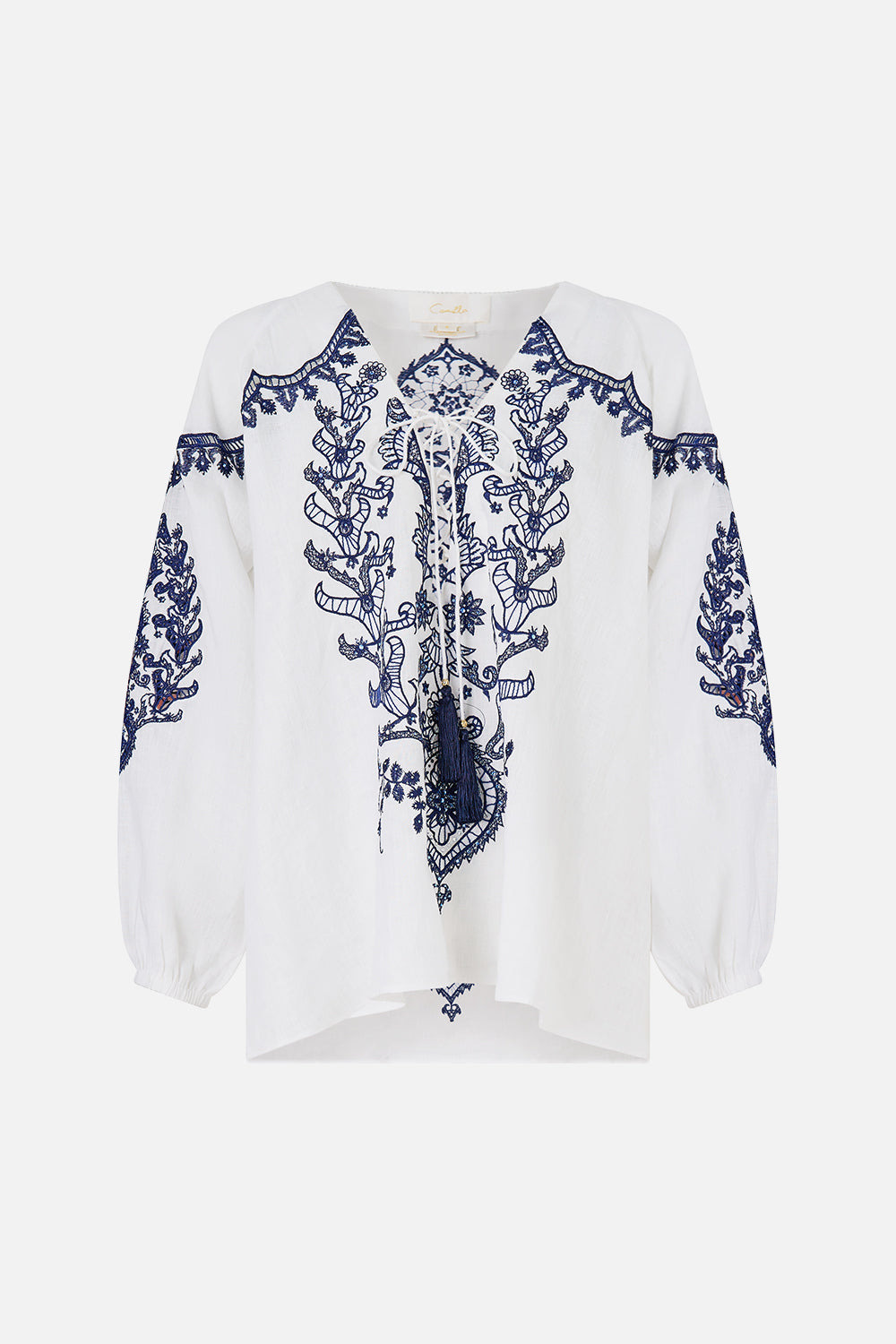 The Isnik Lullaby Lace Up Blouse is a handcrafted linen silhouette designed by our in house artisans. Reimagined in an exclusive limited edition print, our relaxed fitting blouse features a lace-up front detail that is adorned with tassel accents and softly gathered raglan sleeves. Woven with artisanal detail, this lace up blouse is finished with delicate cuffs. - 100% Linen - Lace Up Front - Raglan Sleeves With Cuffs - Tassels - Relaxed Fit SKU 00036551-ISNILULL-XS Size and Fit Our model is 5'10 (178cm) tall and wears a size S (AU 10). Bust: 40in (101.6cm) Waist: 26.5in (67cm) Hips: 38in (96.5cm) Fabric and Care 100% LINEN Made from flax fibres, this lightweight natural fibre offers a timeless aesthetic that adds durability and longevity to any wardrobe. Its breathability keeps your skin cool, minimises moisture and ensures effortless comfort.