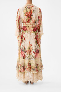 Designed in Australia, the Meet Me At The Majestic Long Button Front Dress draws inspiration from the Majestic Cafe. Soft pinks evoke a romantic allure, capturing the essence of its storied prints. Lovingly handcrafted, this alluring silk maxi dress features a slightly relaxed fit throughout the body that cinches into the adjustable waistline. The flowy maxi skirt falls into an flattering flare with a double ruffle hemline for a feminine touches, while the romantic blouson sleeves taper into a wide shirred cuffs. - Long Length - Double Ruffle Hem - V Neckline - Shaped Waistband With Elastic Back - Crystal Embellishment - Button Front SKU 00034840-MEETMAJE-XXS Size and Fit Our model wears a CAMILLA S and is 5'10 (178cm) tall. Her standard dress size is an AU 10. She has a 32in (83cm) bust, 35in (89.5cm) hips and a 25in (66cm) waist. Camilla S = AU10 / UK10 / US6 Designed and fitted true to size, take your normal size. Fabric and Care 100% SILK With its subtly textured surface, silk crepe is our core fabrication made perfect for versatile wear. With its ability to hold alternative ways to wear, this decadent fabric drapes elegantly off the body whilst keeping you cool with its breathable nature.