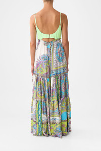 The Magic Carpet Ride Long Dress With Knit Front Bodice is a handcrafted silk silhouette designed by our in house artisans. Reimagined in an exclusive limited edition print, this luxurious dress has a fitted bust to flatter the feminine form and features sumptuous panels that cascade into a full length hemline. It's elevated with a opulent CAMILLA branded hardware closure at the back. - 100% Silk - Fitted Knit Front Bust - Maxi Length - Camilla Branded Hardware Closure At Back - Tiered Dress SKU 00039766-WOVEWOND-XXS Size and Fit Our model is 5'10 (178cm) tall and wears a size S (AU 10). Bust: 40in (101.6cm) Waist: 26.5in (67cm) Hips: 38in (96.5cm) Designed and fitted true to size, take your normal size. Fabric and Care 100% SILK Silk twill is renowned for its diagonally-patterned weave and fluid texture. Its high thread count ensures rich density and durability, while its beautiful sheen provides a luscious touch to the skin.