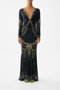 The Amulets And Alchemy Long Sleeve Gathered Dress With Train is a handcrafted silhouette designed by our in house artisans. Reimagined in an exclusive limited edition print, this long sleeve dress features a v neckline that meets gathered panels and falls to a sweeping, floor length hemline. It's finished with crystal embellishments, for luminous detail. - V Neckline - Long Length With Train - Fit And Flare - V Neck - Crystal Embellishment SKU 00039536-AMULALCH-XS Size and Fit Our model is 5'10 (178cm) tall and wears a size S (AU 10). Bust: 40in (101.6cm) Waist: 26.5in (67cm) Hips: 38in (96.5cm) Fabric and Care 92% VISCOSE 8% ELASTANE Viscose is a fibre crafted from the natural substance, cellulose, known for its softness, breathability and drape. It possesses a subtle sheen and is perfect for lightweight soft tailored silhouettes or more structured styles in heavier weights.