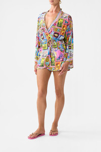 Designed in Australia, The Salty Splendour Long Sleeve Short Robe vibrantly expresses the vibrant ocean energy that mirrors Lisbon's Saint Anthony Festival, alive with music, laughter, and summer's fresh flavours. Lovingly handcrafted, this short robe is finished with a removable tie waist, long sleeves, and front pockets, delivering quiet luxury with its nocrystal simplicity. - Removbable Tie Waist - Short Length - Long Sleeves - Front Pockets - No Crystal Embellishment SKU 00034121-SALTSPLD-S Fabric and Care MAIN: 80% RECYCLED NYLON, 20% ELASTANE