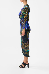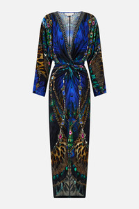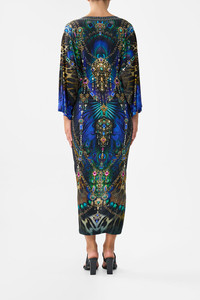 Designed in Australia, the Dominican Decadence Long Split Front Twist Dress unfolds in decadent plumes and iridescent blues, teal waves shimmer like glass, capturing the sparkle of forgotten monuments. Lovingly handcrafted, this CAMILLA jersey midi dress features a relaxed fit throughout the body with a twist drape detail upon the waist. The skirt skims the curves and tapers into a midi length slightly high low hemline with a curved front split for effortless beauty. - Fitted Silhouette From Waist Down - Twist Knot Front Design Detail - Loose Sleeve - Front Split SKU 00035091-DOMIDECA-XXS Size and Fit Designed and fitted true to size, take your normal size. Fabric and Care 92% VISCOSE 8% ELASTANE Viscose is a fibre crafted from the natural substance, cellulose, known for its softness, breathability and drape. It possesses a subtle sheen and is perfect for lightweight soft tailored silhouettes or more structured styles in heavier weights.