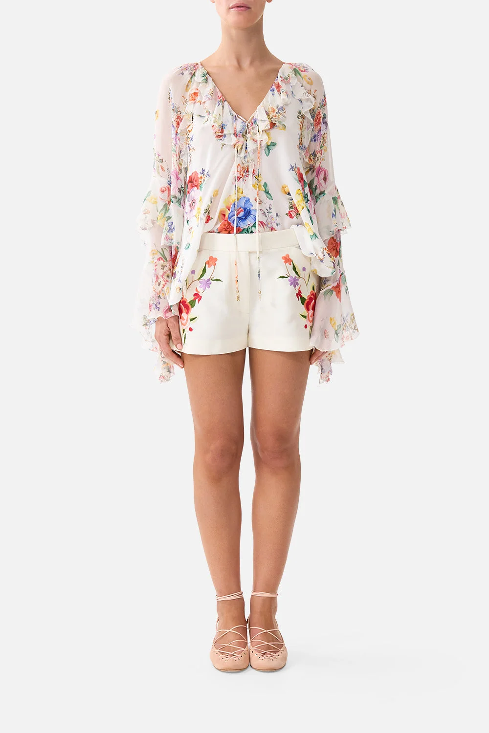 The I Left My Heart In Granada Low Rise Mini Shorts are handcrafted by our in-house artisans. Created in an exclusive limited edition print, our silk-wool mini shorts pay homage to the feminine form. Thoughtfully cut into a cropped hemline, these low rise mini shorts are masterfully embroidered by expert craftsmen and feature subtle contrast piping along functional pocket detailing. - 53% Wool, 47% Silk - Low Rise - Short Length - Side Pockets - Fly Front - Embroidery Details SKU 00041940-ILEFGRAN-XS Size and Fit Our model is 5'10 (178cm) tall and wears a size S (AU 10). Bust: 40in (101.6cm) Waist: 26.5in (67cm) Hips: 38in (96.5cm) Fabric and Care 53% WOOL, 47% SILK