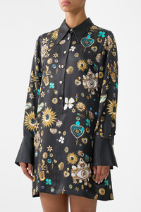 The Amulets And Alchemy Mini Shirt Dress is a handcrafted silhouette designed by our in house artisans. Reimagined in an exclusive limited edition print, our mini shirt dress features elevated collar and cuffed sleeve details. It's finished with intricately placed crystal embellishment. - 100% Silk - Shirt Collar - Short Length - Long Sleeve - Relaxed Fit - Front Button Fastening SKU 00041081-AMULALCH-XXS Size and Fit Our model is 5'10 (178cm) tall and wears a size S (AU 10). Bust: 40in (101.6cm) Waist: 26.5in (67cm) Hips: 38in (96.5cm) Designed and fitted true to size, take your normal size. Fabric and Care 100% SILK Silk satin embodies a sumptuously smooth finish that offers a rich buttery touch to the skin. As a result of the satin weaving technique, it masterfully creates a fuller bounce to the body and drape details.
