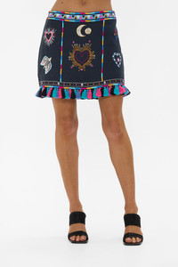 Designed in Australia, The Nubian Nights Mini Skirt awakens the artistry amidst the Nubian Village at nightfall, accenting a starry night adorned with vibrant embroidery motifs and symbolic depictions. Lovingly handcrafted, this mini skirt features a tailored slim fit and a daring mini length. The hem is adorned with exquisite rainbow-coloured fringing, complemented by intricate hand embroidery and radiant crystal embellishments, creating a true wearable artwork. - Slim Fit - Mini Length - Rainbow Coloured Fringing At Hem - Crystal Embellishment - Hand Embroidery SKU 00032252-NUBINIGH-XS Size and Fit Our model wears a CAMILLA S and is 5'10 (178cm) tall. Her standard dress size is an AU 10. She has a 32in (83cm) bust, 35in (89.5cm) hips and a 25in (66cm) waist. Camilla S = AU10 / UK10 / US6 Designed and fitted true to size, take your normal size. Fabric and Care 100%LINEN