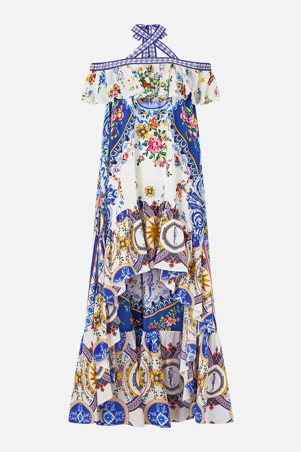 Designed in Australia, the Tiles Darls Off Shoulder Shaped Hem Dress reads the language of florals and tiles, blue and orange hues intertwine, a celebration of artisan hands and enduring beauty. Lovingly handcrafted, this off-shoulder dress with a relaxed fit and high-low hem exudes effortless elegance. The elasticated frill neckline and neck tie offer feminine details that make it a versatile wardrobe piece. - Relaxed Fit - High Low Length - Off-Shoulder Elasticated Frill - Neck Tie SKU 00035820-TILEDARL-S Fabric and Care 100% SILK With its subtly textured surface, silk crepe is our core fabrication made perfect for versatile wear. With its ability to hold alternative ways to wear, this decadent fabric drapes elegantly off the body whilst keeping you cool with its breathable nature.