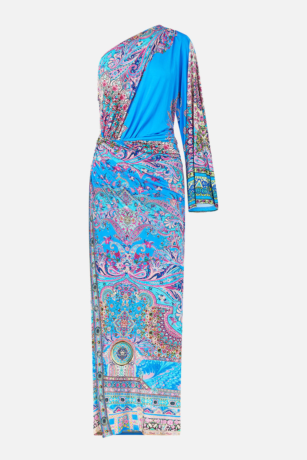 The Footsteps In Folklore One Shoulder Jersey Dress is a handcrafted silhouette designed by our in house artisans. Reimagined in an exclusive limited edition print, this one shoulder dress features an asymmetrical wide sleeve that falls to wrist length. A side split drapes across the form to honour the feminine form and it's finished with intricately placed crystal embellishments for luminous detail. - 92% Viscose, 8% Elastane - Draped Detail - Side Split - Wide Sleeve - Crystal Embellishment SKU 00037052-FOOTFOLT-XS Size and Fit Our model is 5'10 (178cm) tall and wears a size S (AU 10). Bust: 40in (101.6cm) Waist: 26.5in (67cm) Hips: 38in (96.5cm) Designed and fitted true to size, take your normal size. Fabric and Care 92% VISCOSE 8% ELASTANE Viscose is a fibre crafted from the natural substance, cellulose, known for its softness, breathability and drape. It possesses a subtle sheen and is perfect for lightweight soft tailored silhouettes or more structured styles in heavier weights.