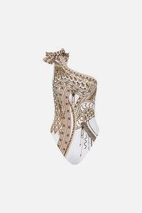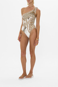 Designed in Australia, The Goddess Energy One Shoulder Tie One Piece With Trim exudes enchantress vivacity with opulent tonal gold and metallic detailing and lotus and snake motifs, imbued on a white canvas. Lovingly handcrafted from ECONYL® regenerated nylon, this sustainable one-piece swimsuit is home to a soft edged all over print, a sleek one shoulder neckline with tie detail neckline, trim detail and an open back. - Fits B-C Cup - Removable Soft Cups And Side Boning For Support - One Shoulder With Tie - Trim Detail On Front Shoulder - ECONYL® Swim SKU 00032468-GODENERG-XS Size and Fit Our model wears a CAMILLA S and is 5'10 (178cm) tall. Her standard dress size is an AU 10. She has a 32in (83cm) bust, 35in (89.5cm) hips and a 25in (66cm) waist. Camilla S = AU10 / UK10 / US6 Designed and fitted true to size, take your normal size. Fabric and Care MAIN: 82% REGENERATED POLYAMIDE, 18% ELASTANE ECONYL® is regenerated nylon, crafted from waste materials that would otherwise end up polluting our Mother Earth. Its beauty lies in its ability to be recycled, remoulded and ultimately reused time and time again. An infinitely recyclable product that keeps our planet looking beautiful, it opens the door to a circular fashion sphere.