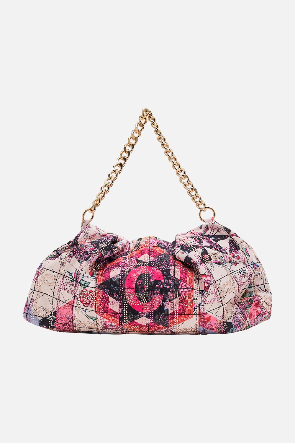 The Patchwork Poetry Oversized Clutch With Chain celebrates a vibrant palette of intricate hand-crafted floral patchwork patterns and delicate lace details. This luxury evening clutch features a generous sized bespoke printed silhouette. Adorned with a chunky detachable strap, a sleek mag enclosure and shimmers of crystal embellishments for elevated opulence. Explore more from the Wonderkind collection. - Lovingly Handcrafted - Designed in Australia - CAMILLA Accessories - Bespoke printed - Detachable chain strap - Crystal embellished - Mag snap opening - W 51cm x H 29cm SKU 00029254-PATCPOET-O/S Fabric and Care MAIN 100% POLYESTER LINING 100%VISCOSE TWILL