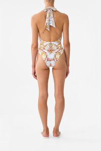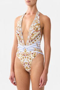 Designed in Australia, The Throne Games Plunge Neck Halter One Piece With Front Trim welcomes you to the Palace of Queluz, where ornate rococo details and fine architectural artistry are framed by an elegant floral border. Lovingly handcrafted, this luxury one-piece swimsuit showcases a plunge front V neck. The streamlined silhouette features a high cut leg that elongates the leg and removable soft cups for added support, giving this lavishly opulent one-piece its allure. - Fits B-C Cup - Removable Soft Cups - Halter Neck Tie And High Leg Line - Dry Handle Heavy Weight Fabrication - Front Trim Detail - Crystal Embellishment - ECONYL® swim SKU 00034378-THRNGMES-XS Size and Fit Our model wears a CAMILLA S and is 5'10 (178cm) tall. Her standard dress size is an AU 10. She has a 32in (83cm) bust, 35in (89.5cm) hips and a 25in (66cm) waist. Camilla S = AU10 / UK10 / US6 Designed and fitted true to size, take your normal size Fabric and Care MAIN: 79% POLYAMIDE, 21% ELASTANE