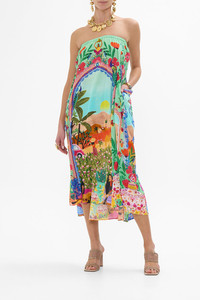 In this collaboration, CAMILLA artisans come together with artist Roeqiya Fris, blending her signature aesthetic with distinctive CAMILLA elegance to craft unparalleled wearable masterpieces. A hallmark of her work is the profound focus on striking colour schemes and elegant feminine centrality. With a distinguished blend of Arab and Dutch heritage, the Egyptian influence prominently shapes her cultural and artistic expression. The Queens Of Creation Pocket Skirt Dress captures the essence of vibrant archways framing lush gardens bursting with colour and vitality. This exquisite print envisions women from local communities immersed in their creative realms—celebrating music, art, and the rich traditions of pottery and painting. This luxury dress features and elasticated waistband and statement patch pocket details. Able to worn as a high waisted maxi skirt or as a strapless dress this CAMILLA skirt dress exudes lavish wearability. Explore more from the House Of The Sun collection. - Lovingly Handcrafted - Designed in Australia - CAMILLA Ready-To-Wear - Elastic waist - Side pockets - Maxi length - Crystal embellishment - Multi wear SKU 00035955-QNOCREAT-XS Size and Fit Our model wears a CAMILLA S and is 5'10 (178cm) tall. Her standard dress size is an AU 10. She has a 32in (83cm) bust, 35in (89.5cm) hips and a 25in (66cm) waist. Camilla S = AU10 / UK10 / US6 Designed as a relaxed fit take your normal size Fabric and Care 100% SILK