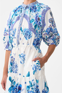 The A Ceramic Garden Puff Sleeve Midi Shirt Dress is a handcrafted silhouette designed by our in house artisans. Reimagined in an exclusive limited edition print, this puff sleeve dress features a tiered skirt that falls to mid length and an elasticated waist for relaxed definition. Adorned with short puff sleeves, its finished with a front button fastening for effortless wear. - 100% Organic Cotton - Tiered Midi Skirt - Short Puff Sleeves - Elasticated Waist - Front Button Fastening SKU 00037047-CERAGARD-XXS Size and Fit Our model is 5'10 (178cm) tall and wears a size S (AU 10). Bust: 40in (101.6cm) Waist: 26.5in (67cm) Hips: 38in (96.5cm) Designed and fitted true to size, take your normal size. Fabric and Care 100% ORGANIC COTTON Organic cotton poplin is sumptuously smooth with a crisp, refined weave. This lightweight silken fabric drapes beautifully and is ideal for sleek contours and tailored, defined styles.