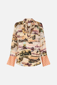 Fabricated with breathtaking precision and awe inspiring luxury, this collector's treasure is a CAMILLA best-selling creation. The Milla's Got Mail Pyjama Shirt showcases luscious pink sunset skies upon an endless oasis of desert palms and majestic pyramids.This CAMILLA silk shirt features a relaxed fit throughout the body that falls to hip length hemline. The relaxed long sleeves feature wide split cuffs that dance effortlessly at the wrist. - Lovingly Handcrafted - Designed in Australia - CAMILLA Ready-To-Wear - Crystal embellishment - Front button enclosure - Wide cuffs - Open collar - Back yoke detail - Centre back pleat detail - Can be worn as a matching set SKU 00030305-MILLMAIL-XXS Size and Fit Our model wears a CAMILLA S and is 5'10 (178cm) tall. Her standard dress size is an AU 10. She has a 32in (83cm) bust, 35in (89.5cm) hips and a 25in (66cm) waist. Camilla S = AU10 / UK10 / US6 Designed as a relaxed fit take your normal size Fabric and Care 100% SILK Silk satin embodies a sumptuously smooth finish that offers a rich buttery touch to the skin. As a result of the satin weaving technique, it masterfully creates a fuller bounce to the body and drape details.