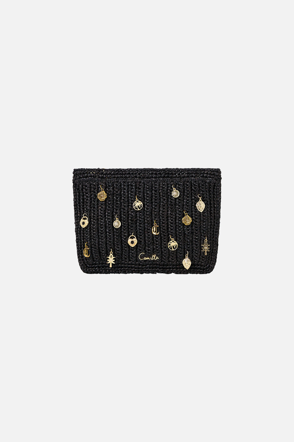 The Solid Black Raffia Clutch With Charms is a handcrafted accessory designed by our in house artisans. Reimagined for an exclusive limited edition collection, this clutch is woven from natural raffia and is embellished with bespoke CAMILLA charms. Its finished with a secure zip top closure to keep your treasures safe. - 100% Raffia - Raffia Body - Custom Design Charm Embellishments - Zip Top Closure - Width 22.5cm X Height 15cm SKU 00040891-SOLIDBLA-O/S Size and Fit Our model wears a CAMILLA O/S and is 5'10 (178cm) tall. Her standard dress size is an AU 10. She has a 32in (83cm) bust, 35in (89.5cm) hips and a 25in (66cm) waist. Fabric and Care MAIN: 100% RAFFIA