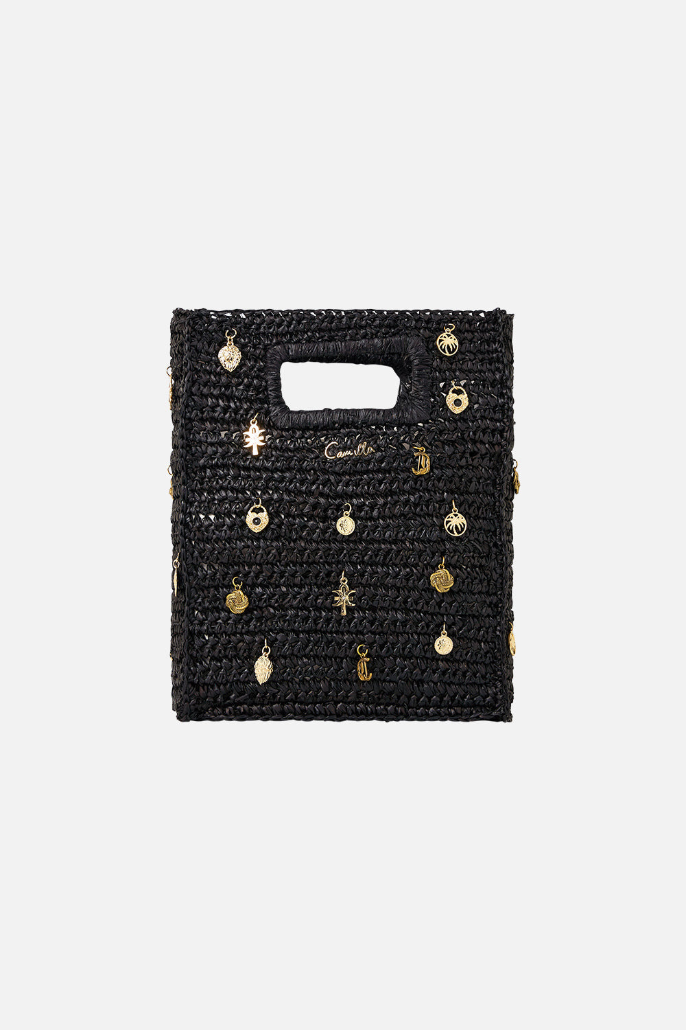 The Solid Black Raffia Mini North South Tote With Charms is a handcrafted accessory designed by our in house artisans. Reimagined for an exclusive limited edition collection, this mini tote is woven from natural raffia and adorned with bespoke CAMILLA charms. - 100% Raffia - Raffia Body - Custom Design Charm Embellishments - North South Shape - Width 23cm X Height 26cm SKU 00039394-SOLIDBLA-O/S Fabric and Care MAIN: 100% RAFFIA
