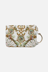 Designed in Australia, the Dressing Room Drama Ring Scarf Clutch unveils a black base fused with florals and gilded arches, echoing the regal opulence of the Palace of Queluz—a poetic nod to throne rooms and the queen's dressing sanctuary. Lovingly handcrafted this bespoke evening clutch bag showcases a signature CAMILLA print upon a sumptuous rectangular silhouette. The statement custom ring hardware is adorned with a detachable silk scarf and the zip top enclosure ensures sleek storage for all your treasures. - Crystal Embellishment - Internal Zip Pocket - Hardware Ring - Detachable Scarf - 26CM X 18.5CM SKU 00035863-DRESDRAM-O/S Size and Fit Our model wears a CAMILLA O/S and is 5'10 (178cm) tall. Her standard dress size is an AU 10. She has a 32in (83cm) bust, 35in (89.5cm) hips and a 25in (66cm) waist. Fabric and Care MAIN: 100% SILK Silk satin embodies a sumptuously smooth finish that offers a rich buttery touch to the skin. As a result of the satin weaving technique, it masterfully creates a fuller bounce to the body and drape details.