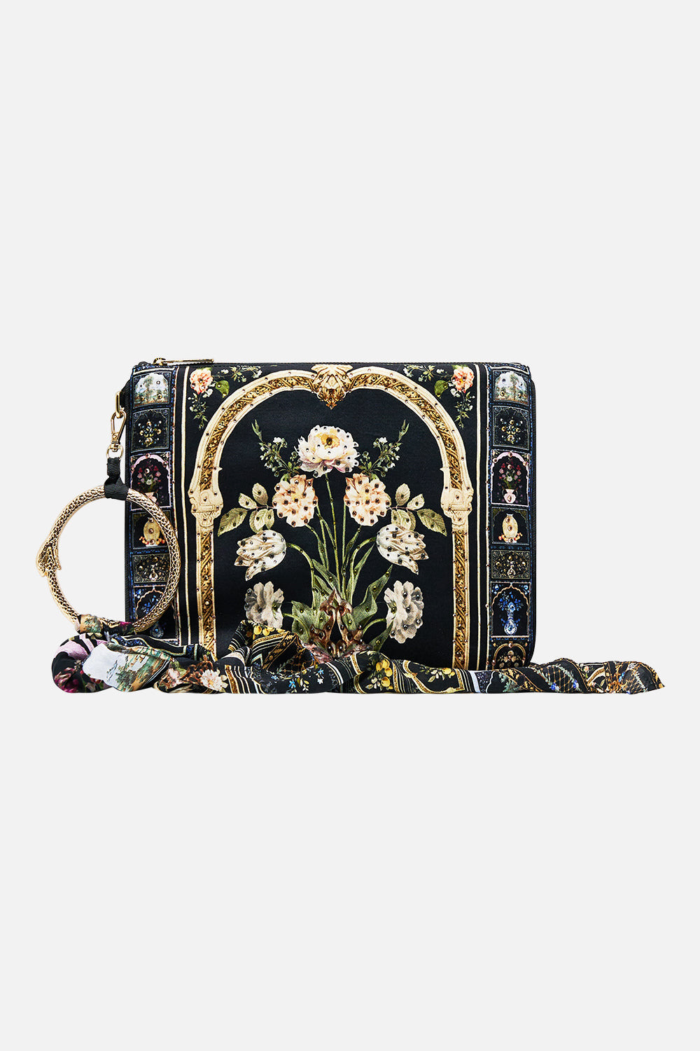 The Ottoman Elegance Ring Scarf Clutch is a handcrafted silk silhouette designed by our in house artisans. Reimagined in an exclusive limited edition print, our zip-top clutch features a signature hardware ring wrapped with a detachable printed scarf. Crystal embellishment adds radiant detail, while an internal zip pocket keeps your essentials secure. - 100% Silk - Crystals - Internal Zip Pocket - Custom Hardware Ring - Detachable Scarf - Zip Top Opening - 26cm X 18.5cm SKU 00037567-OTTOELEG-O/S Size and Fit Our model wears a CAMILLA O/S and is 5'10 (178cm) tall. Her standard dress size is an AU 10. She has a 32in (83cm) bust, 35in (89.5cm) hips and a 25in (66cm) waist. Fabric and Care MAIN: 100% SILK Silk satin embodies a sumptuously smooth finish that offers a rich buttery touch to the skin. As a result of the satin weaving technique, it masterfully creates a fuller bounce to the body and drape details.