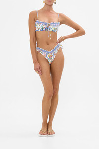 Designed in Australia, the Tiles Darls Ruched Tie Side Pant reads the language of florals and tiles, blue and orange hues intertwine, a celebration of artisan hands and enduring beauty. Lovingly handcrafted, these tie-side pants feature high leg coverage, side ties, and ruching on the front and back for a flattering fit. The skimpy bottom and crystal embellishments offer an elevated swimwear option. - Skimpy Bottom Coverage - Side Ties - Dipped Waist - High Leg - String Tie Front - Ruching On Front And Back - Crystal Embellishment SKU 00035678-TILEDARL-XS Fabric and Care MAIN: 82% REGENERATED POLYAMIDE, 18% ELASTANE ECONYL® is regenerated nylon, crafted from waste materials that would otherwise end up polluting our Mother Earth. Its beauty lies in its ability to be recycled, remoulded and ultimately reused time and time again. An infinitely recyclable product that keeps our planet looking beautiful, it opens the door to a circular fashion sphere.
