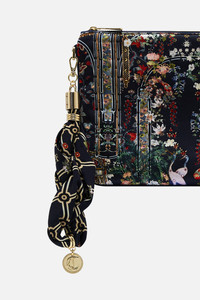 Designed in Australia, The Palacio Poetry Scarf Clutch unravels an oasis where cranes soar among lush ferns, intricate tilework, and dreamlike ceramics—a soft navy sanctuary, each detail whispering stories of wonder. Lovingly handcrafted, this luxury evening clutch bag showcases a signature bespoke print upon its sumptuous rectangular silhouette. The detachable twisted scarf wristlet and the zip top enclosure with golden hardware ensures a sleek yet statement wearability. - CAMILLA Printed - Detachable Scarf Wristlet - Crystals - Zip Top Opening SKU 00034133-PLCIPOET-O/S Size and Fit Our model wears a CAMILLA O/S and is 5'10 (178cm) tall. Her standard dress size is an AU 10. She has a 32in (83cm) bust, 35in (89.5cm) hips and a 25in (66cm) waist. Fabric and Care MAIN: 100% SILK