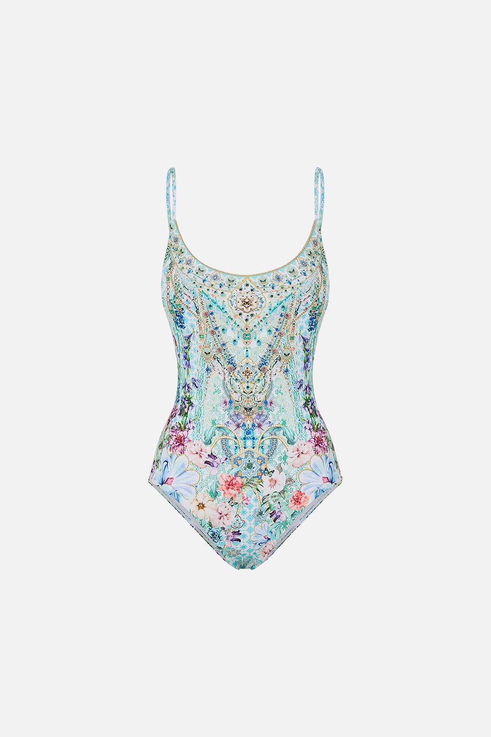 Designed in Australia, The Sunrise In Sintra Scoop Neck One Piece celebrates lush gardens and eclectic nineteenth-century architecture, where light blues and intricate tiles reflect exotic motifs, inviting you into botanical beauty. Lovingly handcrafted, this luxury one piece swimsuit features a fitted silhouette throughout the body that falls from an elegant scoop neckline. The high cut elongates the legline for an exceptionally sleek line. - To Fit B-C Cup - Removable Soft Cups - Adjustable Straps - Round Neck - Regular To Low Leg Line - Crystal Embellishment - SKU 00034188-SUNRSINT-XS Size and Fit Designed and fitted true to size, take your normal size Fabric and Care MAIN: 82% REGENERATED POLYAMIDE, 18% ELASTANE ECONYL® is regenerated nylon, crafted from waste materials that would otherwise end up polluting our Mother Earth. Its beauty lies in its ability to be recycled, remoulded and ultimately reused time and time again. An infinitely recyclable product that keeps our planet looking beautiful, it opens the door to a circular fashion sphere.