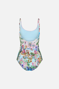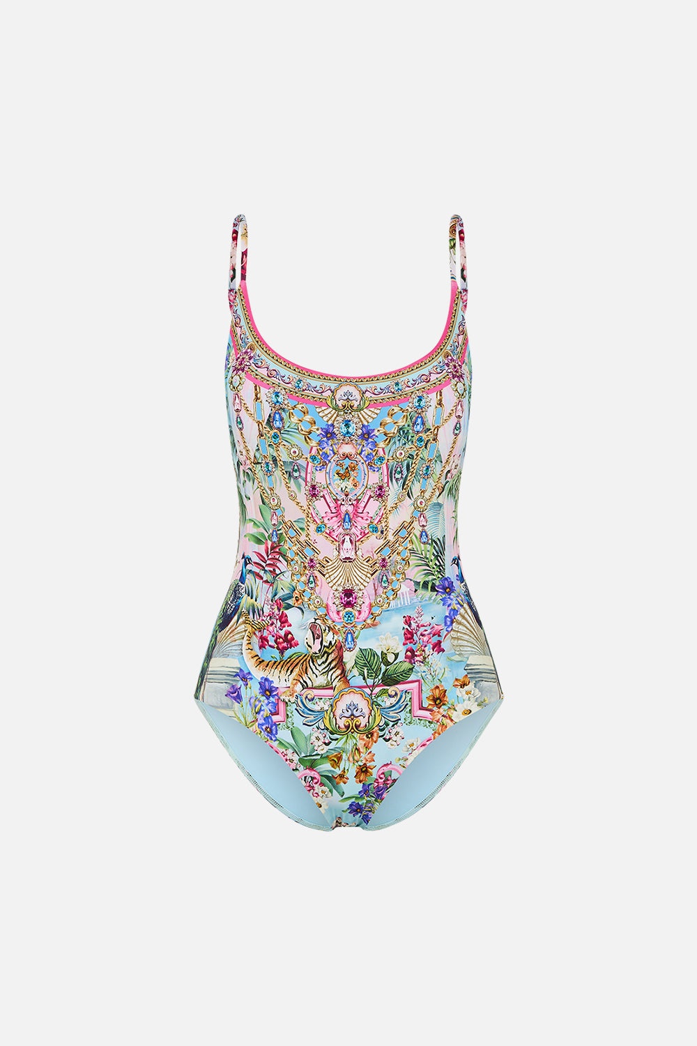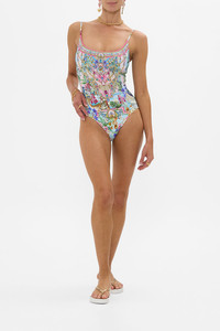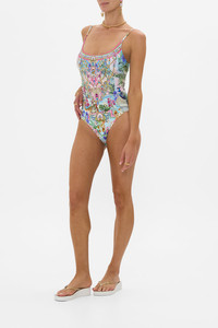 Designed in Australia, the Spirit Of Santa Maria Scoop Neck One Piece dances in pastel hues and vibrant painterly graphics, inspired by the electric beauty of Igreja Matriz De Santa Maria and its radiant frescoes. Lovingly handcrafted, this luxury one piece swimsuit features a fitted silhouette throughout the body that falls from an feminine scoop neckline. The high cut elongates the leg line for an exceptionally sleek line. - To Fit B-C Cup - Removable Soft Cups - Adjustable Straps - Round Neck - Regular To Low Leg Line SKU 00035529-SPIRMARI-XS Size and Fit Designed and fitted true to size, take your normal size. Fabric and Care MAIN: 82% REGENERATED POLYAMIDE, 18% ELASTANE ECONYL® is regenerated nylon, crafted from waste materials that would otherwise end up polluting our Mother Earth. Its beauty lies in its ability to be recycled, remoulded and ultimately reused time and time again. An infinitely recyclable product that keeps our planet looking beautiful, it opens the door to a circular fashion sphere.