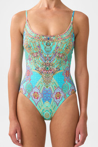 The Concubines Corridor Scoop Neck One Piece With Scoop Back is a handcrafted silhouette designed by our in house artisans. Reimagined in an exclusive limited edition print, our scoop neck one piece is made with B to C cups in mind. Featuring a soft scoop neckline and scoop back, it has adjustable straps and soft removable cups for tailored support. Cut with a regular-to-low leg line and moderate bottom coverage, this silhouette balances comfort with a flattering fit. - To Fit B-C Cup - Removable Soft Cups, Scoop Neckline - Regular To Low Leg Line, Regular Bottom Coverage - Adjustable Straps - Scoop Back Detail - Crystal Embellishment SKU 00037475-CONCCORR-XS Size and Fit Our model is 5'10 (178cm) tall and wears a size S (AU 10). Bust: 40in (101.6cm) Waist: 26.5in (67cm) Hips: 38in (96.5cm) Designed and fitted true to size, take your normal size. Fabric and Care MAIN: 82% REGENERATED POLYAMIDE, 18% ELASTANE ECONYL® is regenerated nylon, crafted from waste materials that would otherwise end up polluting our Mother Earth. Its beauty lies in its ability to be recycled, remoulded and ultimately reused time and time again. An infinitely recyclable product that keeps our planet looking beautiful, it opens the door to a circular fashion sphere.