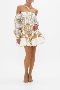 Designed in Australia, the Dressing Room Drama Seamed Off The Shoulder Dress embodies a white base fused with florals and golden arches, inspired by the arabesque opulence of the Palace of Queluz and its storied princess chambers. Lovingly handcrafted, this off-the-shoulder dress features a fitted corset bodice and blouson sleeves. Crystal embellishments enhance its sophisticated design, making it a perfect balance of sensuality and elegance. - Off Shoulder Style - Fitted Corset Bodice - Blouson Sleeve - Crystal Embellishment SKU 00034740-DRESDRAM-XXS Fabric and Care 82% LINEN 18% SILK Silk Linen is a beautiful combination of natural fabrics which blend into a luxurious, soft and smooth texture. Cool to touch with a subtle sheen and luster from silk components, its breathable, durable and has a crisp, textured hand feel.